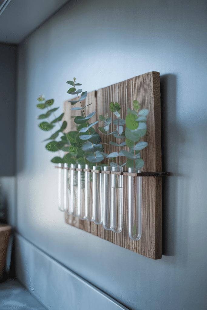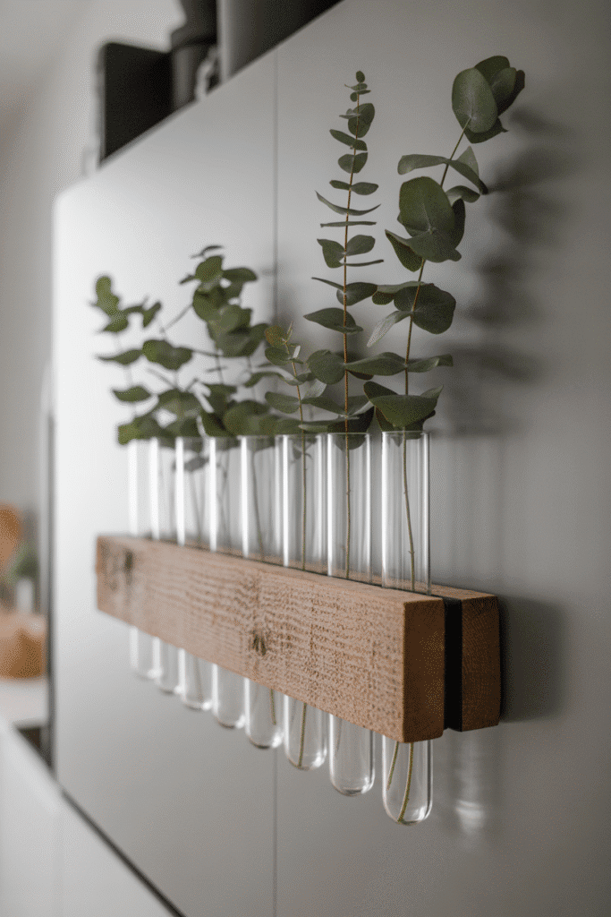 Mount a series of glass test tube vases vertically onto a rustic wood plank. Fill each one with single-stem greenery such as eucalyptus or craspedia for a clean and natural feel. This setup adds an organic, almost botanical lab vibe that fits beautifully in hallways or modern kitchens. For extra impact, choose wood with visible grain or a weathered finish.