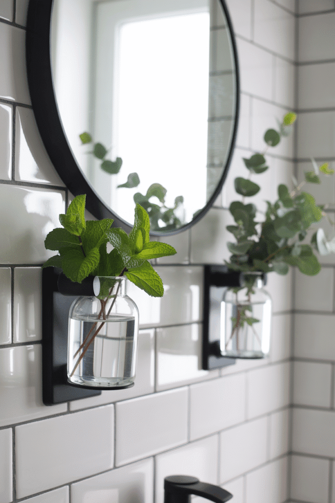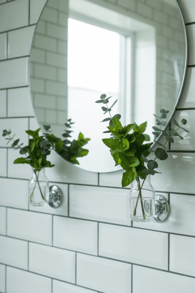 Mount tiny glass or ceramic vases on either side of a bathroom mirror. Fill them with fresh herbs like mint or eucalyptus for a scent that freshens the space naturally. The subtle touch of green breaks up tile or wall surfaces beautifully. This is especially useful in guest bathrooms or small powder rooms where space is limited but design still matters.