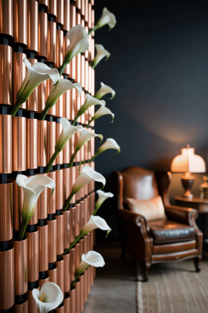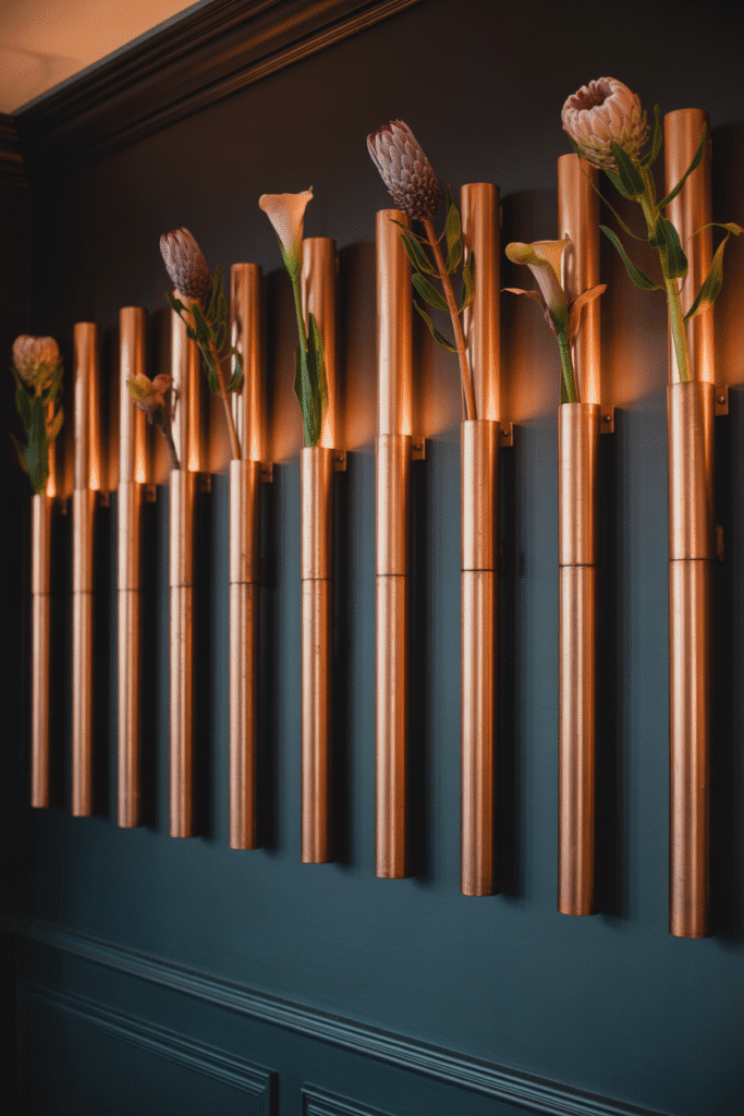 Use vertical copper or brass wall tubes, arranged in a group or line, to hold long-stemmed blooms. These metallic tones introduce warmth and a subtle vintage appeal. They catch and reflect light throughout the day, offering a dynamic design element. Try installing them above a headboard or in a quiet reading corner for understated elegance.