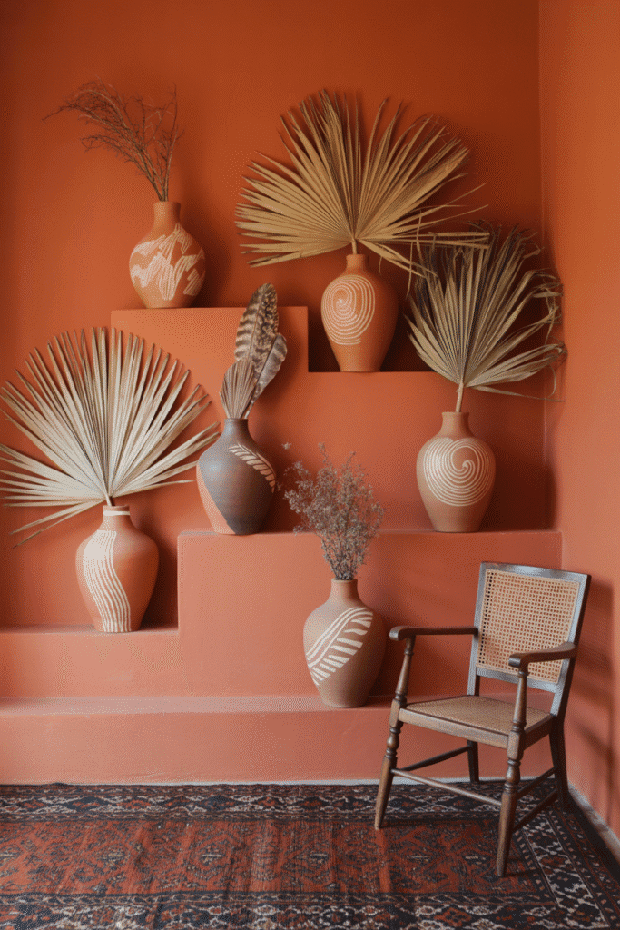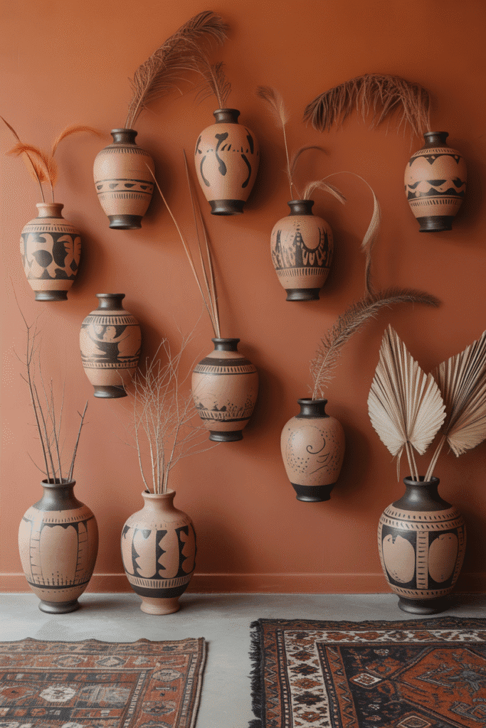 Choose hand-painted clay vases in earthy or vivid colors and mount them on a wall painted in a contrasting shade. The combination of bold wall color and artisanal pottery creates a layered, gallery-like experience. Fill the vases with simple branches or dried palm leaves. Ideal for artistic living spaces or creative home offices.