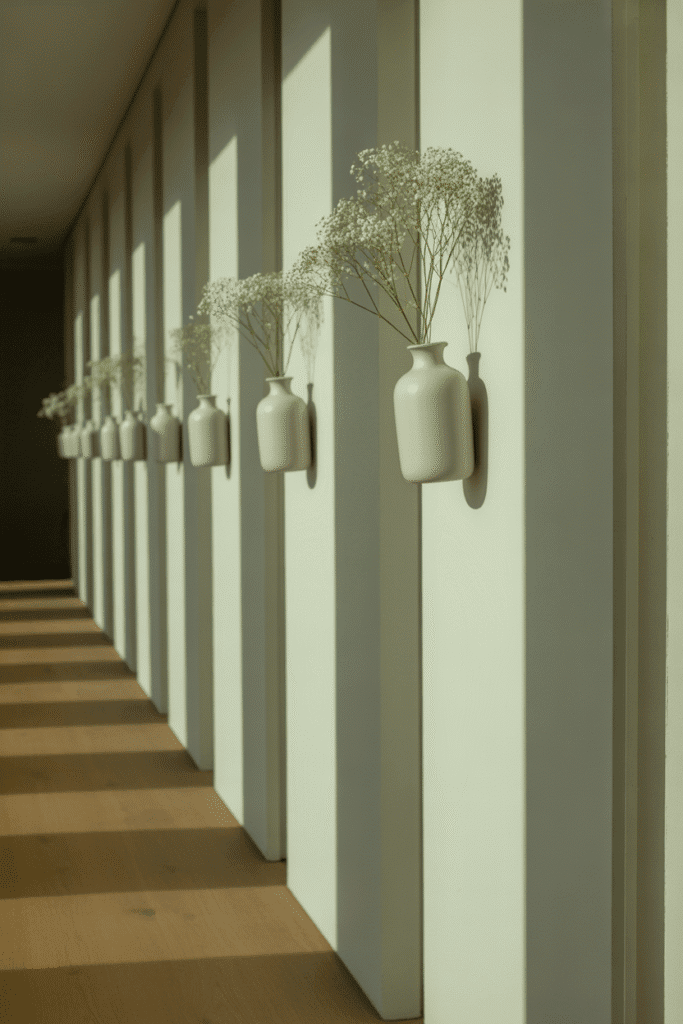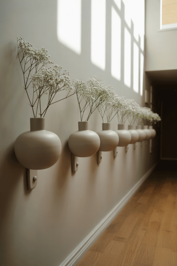 Choose identical vases in a soft, matte tone such as white or charcoal and arrange them evenly along a hallway wall. Use the same plant or flower in each vase to maintain a clean and cohesive aesthetic. This repeated motif brings visual rhythm to long, narrow spaces. The look is refined and easy to maintain with faux florals or dried stems.