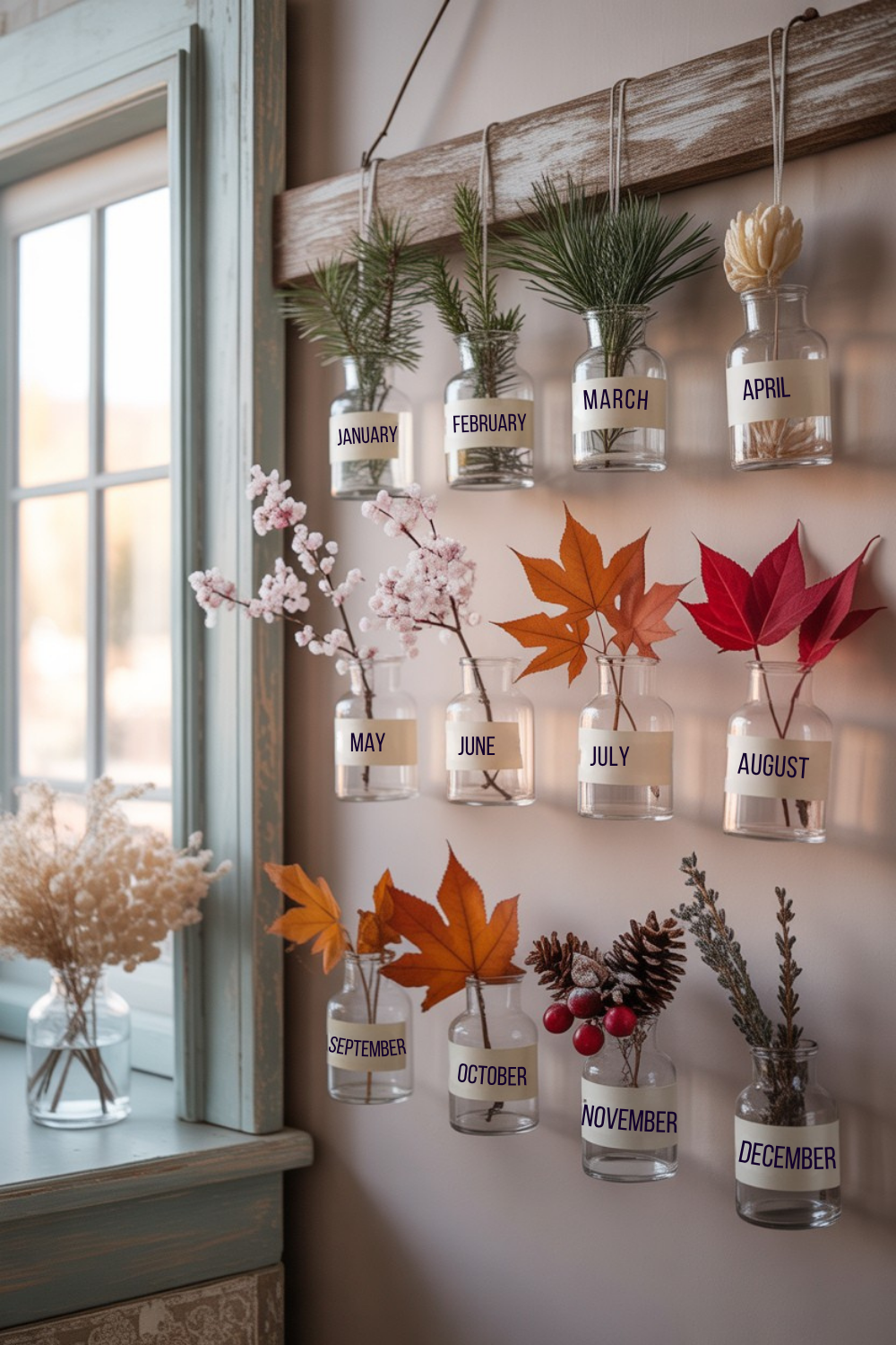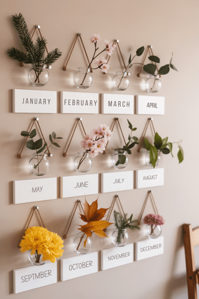 Designate a wall for twelve small hanging vases, each labeled for a different month. Change the contents monthly to reflect the natural cycle of blooms and colors. From winter berries to spring blossoms, this interactive wall art keeps your decor fresh and seasonally tuned. It is a creative way to celebrate the passage of time with style and grace.