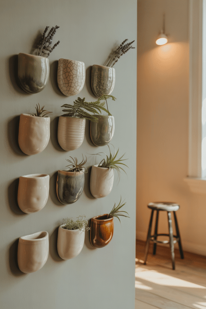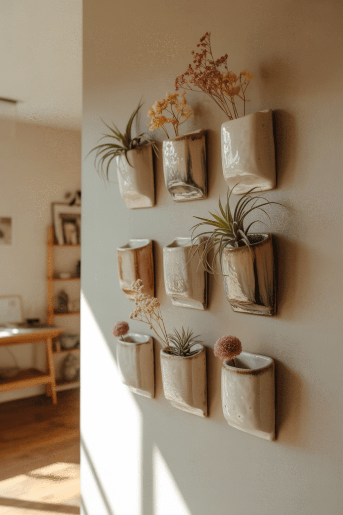 Install ceramic wall pockets in a symmetrical or staggered grid pattern. Choose handmade designs with subtle texture or glaze variations for added depth. Fill them with dried florals, air plants, or even paintbrushes for a functional yet artistic look. This concept works especially well in dining rooms or home studios where beauty meets purpose.