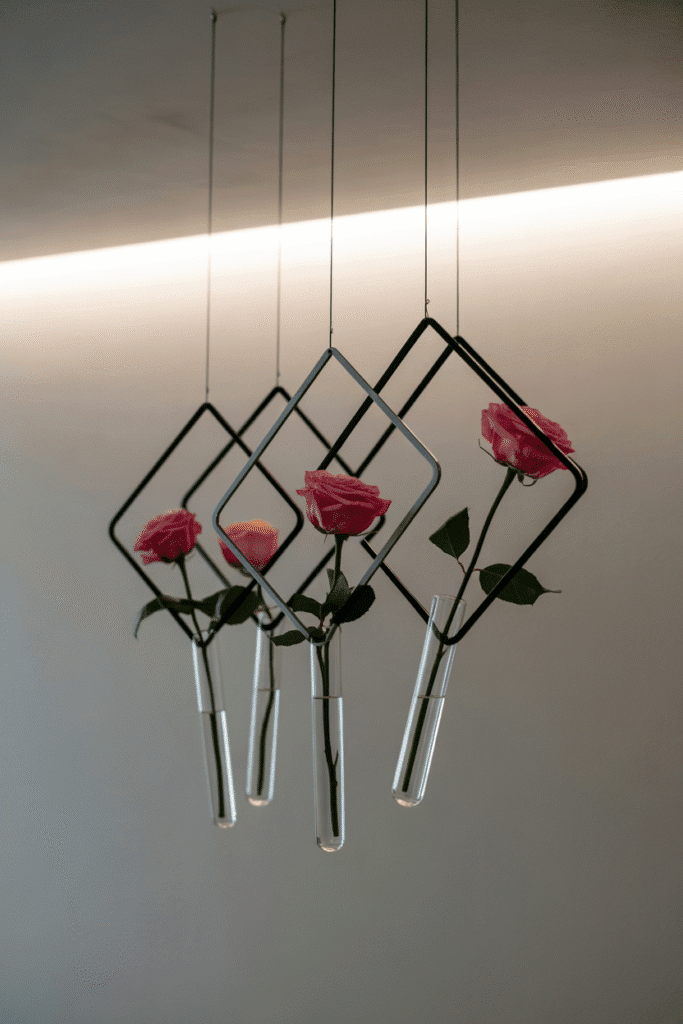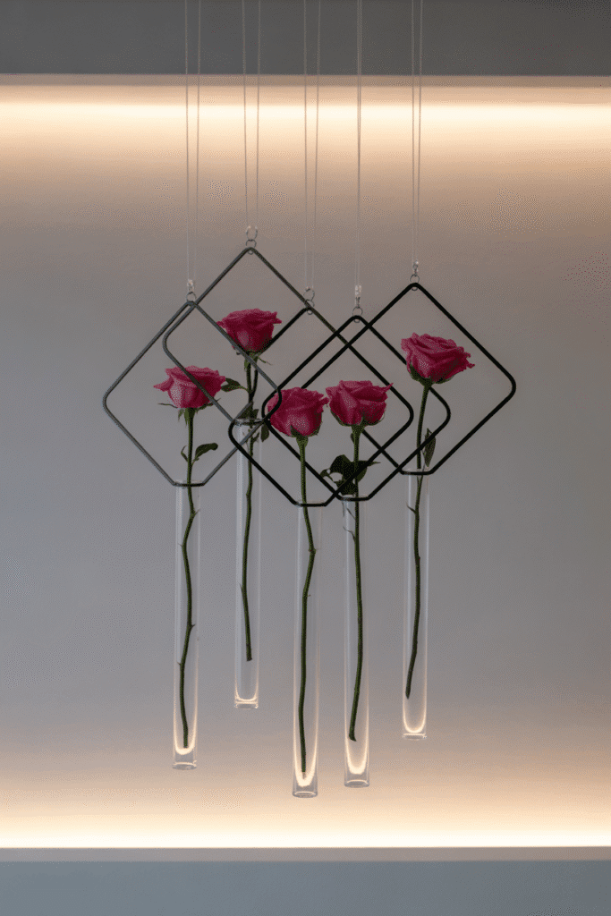Look for metal-framed wall vases shaped like diamonds or hexagons, fitted with slim glass vials. Suspend them using leather or cotton cords for added contrast. This design creates a striking balance between structure and delicacy. Place a single flower in each vial and use repetition to create a unified modern display.