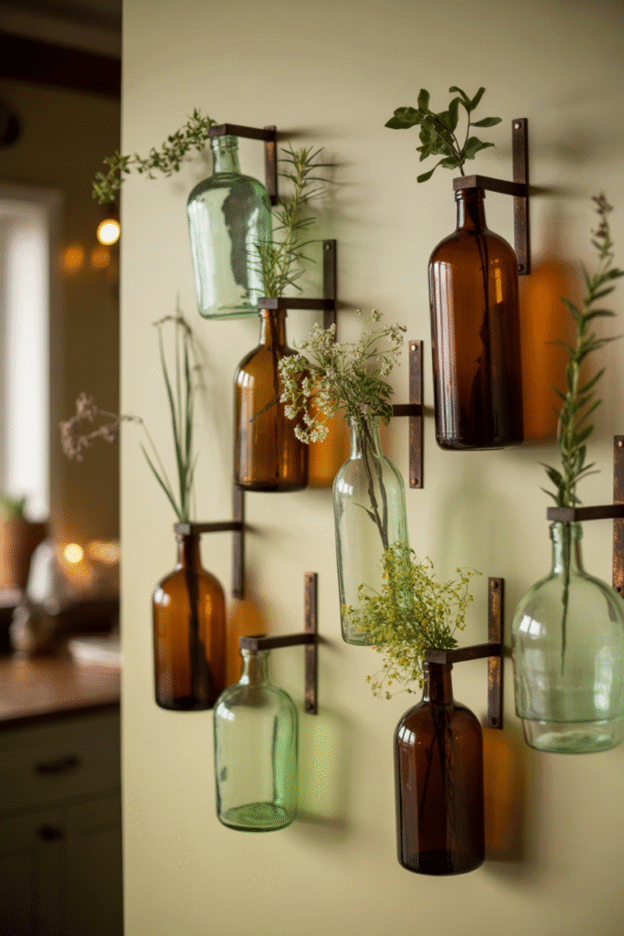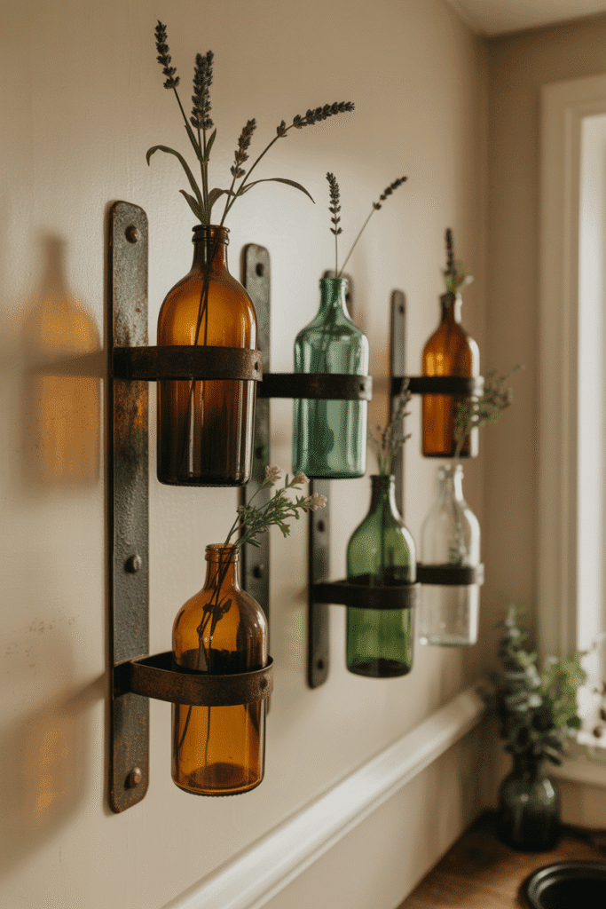 Use antique glass bottles mounted on wooden boards or directly onto the wall with metal brackets. These can hold sprigs of herbs or fresh-cut flowers. The result is nostalgic, warm, and subtly decorative. Group different bottle shapes and glass tones for a visually layered effect that brings character to kitchens or reading nooks.