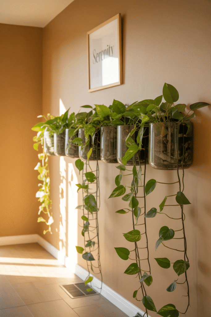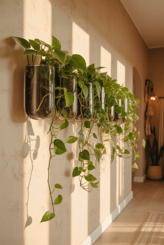 Install a horizontal row of slim vases and place trailing plants like pothos or philodendron in each one. As the plants grow, they cascade downward and soften the wall with natural greenery. This approach not only decorates the wall but also adds an evolving element to the space. Perfect for living rooms or sun-drenched corridors.