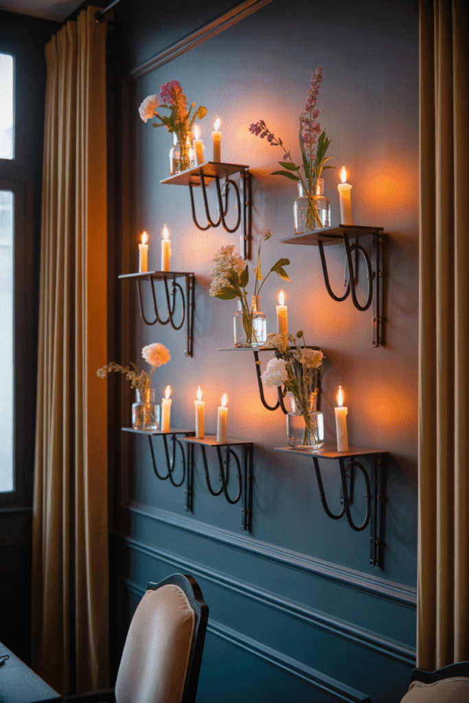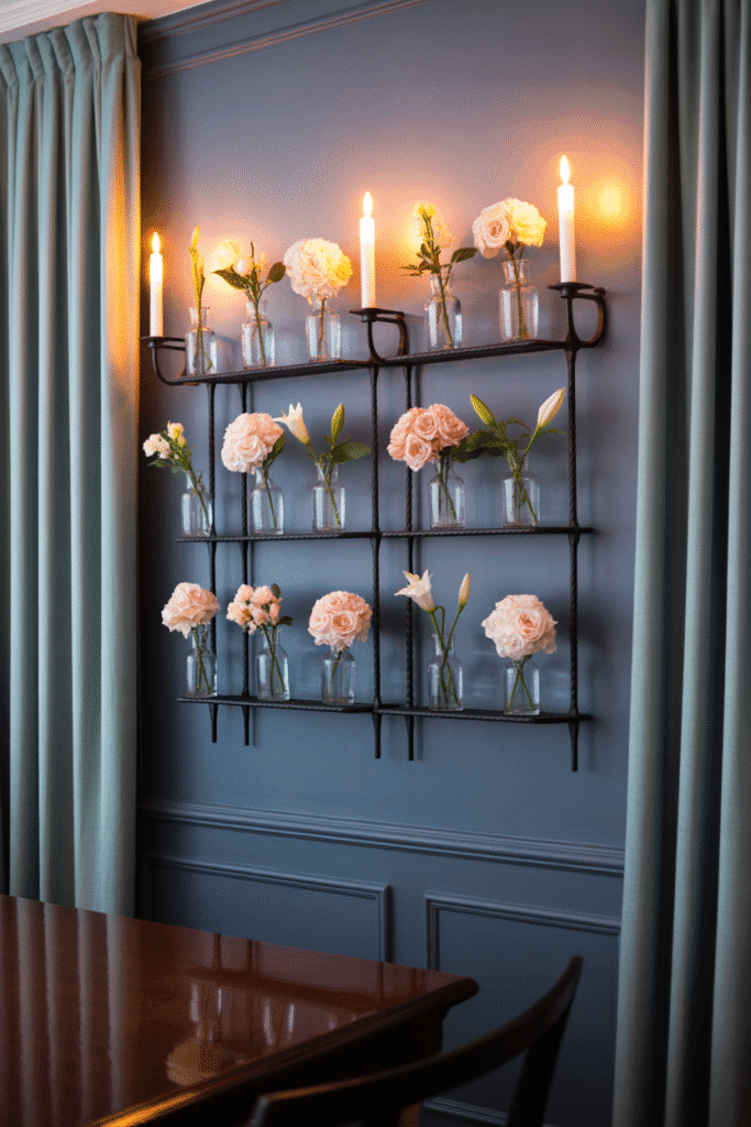 Combine wall-mounted bud vases and candle sconces in alternating patterns. Use flowers that reflect the seasons or your mood and pair them with warm lighting. This layered effect brings elegance and mood to living or dining areas. The alternating symmetry draws the eye and adds dimension without overwhelming the wall.