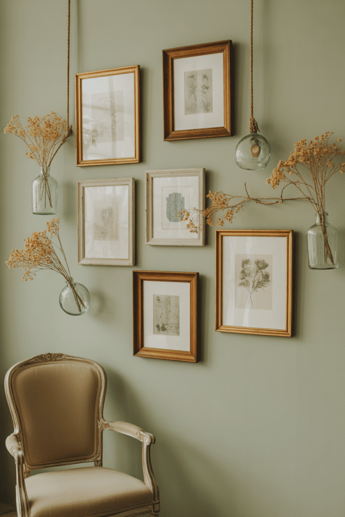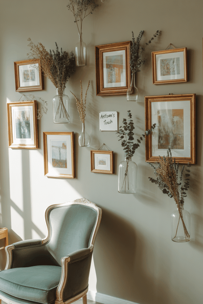 Enhance your gallery wall by interspersing small hanging vases between art and photo frames. Choose vases that match the frame materials or contrast them intentionally. Use dried flowers or greenery that complements the art color palette. This approach adds texture and life to a space already rich in visual interest.