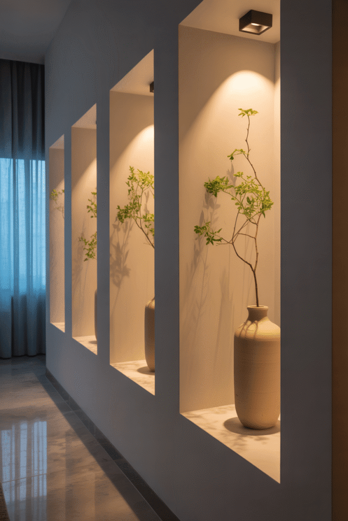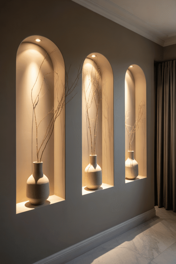 If you have built-in wall recesses, use them to display narrow vertical vases. Add single branches or minimalist arrangements that enhance the architectural lines of your space. This idea feels intentional and curated. It turns underused alcoves into elegant visual statements without needing heavy decor.