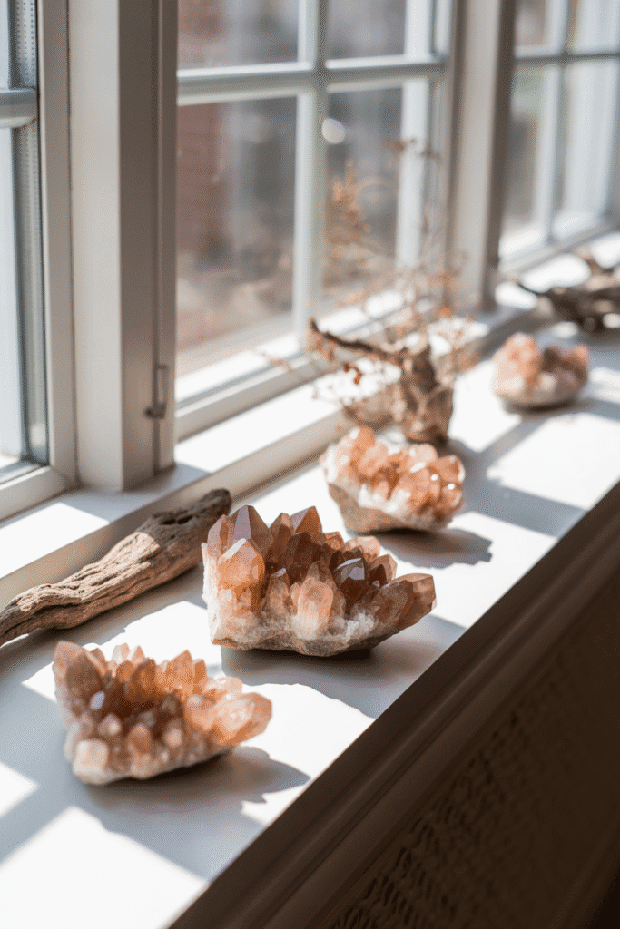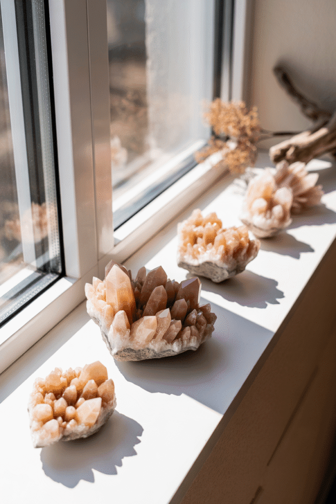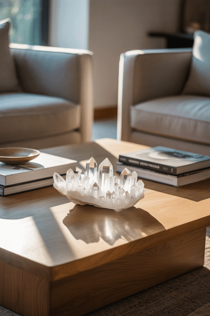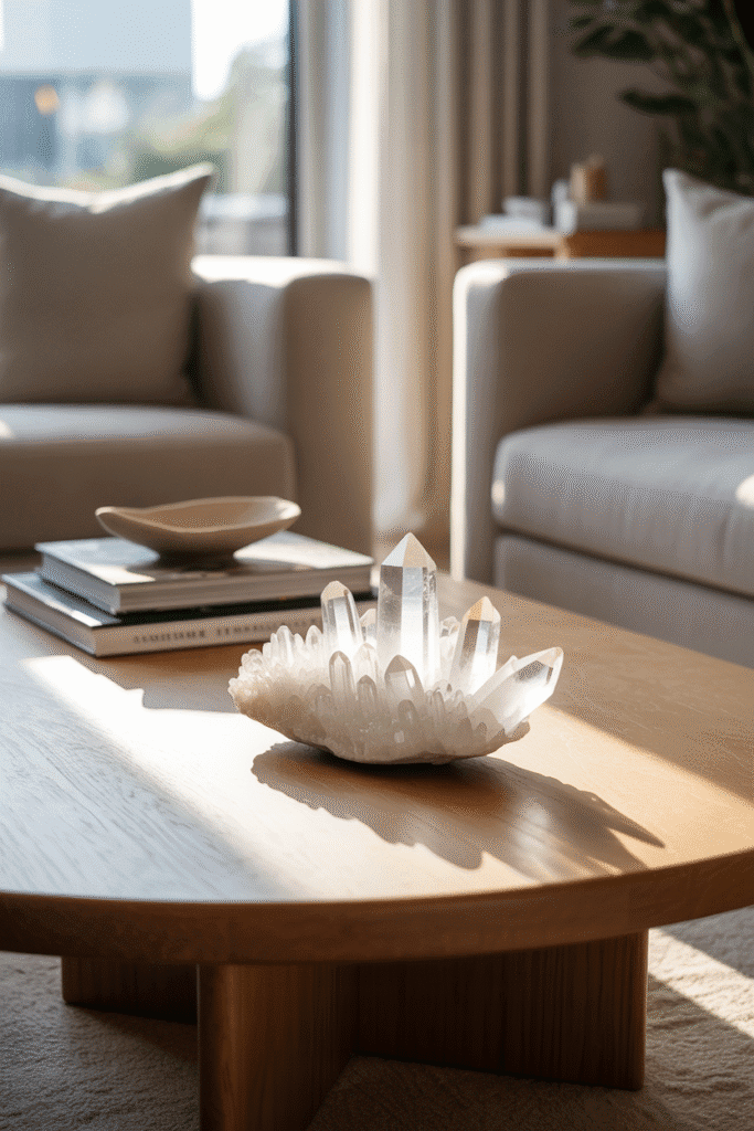 Place a large clear quartz or rose quartz cluster at the center of your coffee table. Use it to break up straight lines and bring a natural focal point to the room. Pair it with a stack of books or a ceramic dish for balance. The crystal catches light beautifully and adds subtle movement to an otherwise flat surface. This is especially effective in modern living rooms with neutral tones.