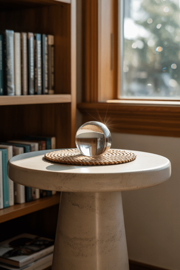 Set a clear quartz sphere on a small stand or pedestal in a quiet corner. The round shape softens the room and invites interaction. Use it in a meditation space, home library, or sunlit window seat. The crystal reflects light in all directions, making the space feel alive. Add a linen cloth or woven mat underneath for texture.