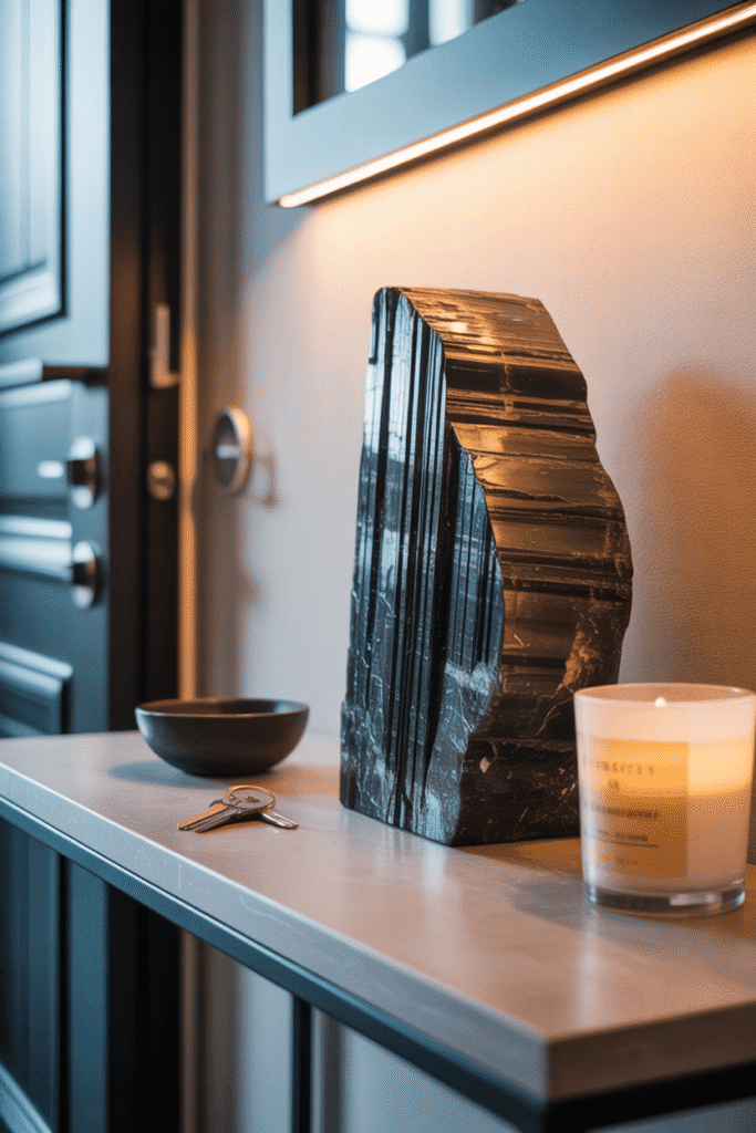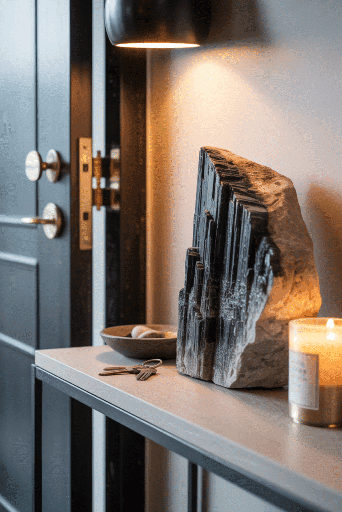 Black tourmaline is often used for grounding and protection. Set a substantial piece near your front door, either on a console or low shelf. It introduces natural texture right at the entrance. Pair it with a small bowl for keys or a scented candle for balance. This creates a calm and welcoming first impression.