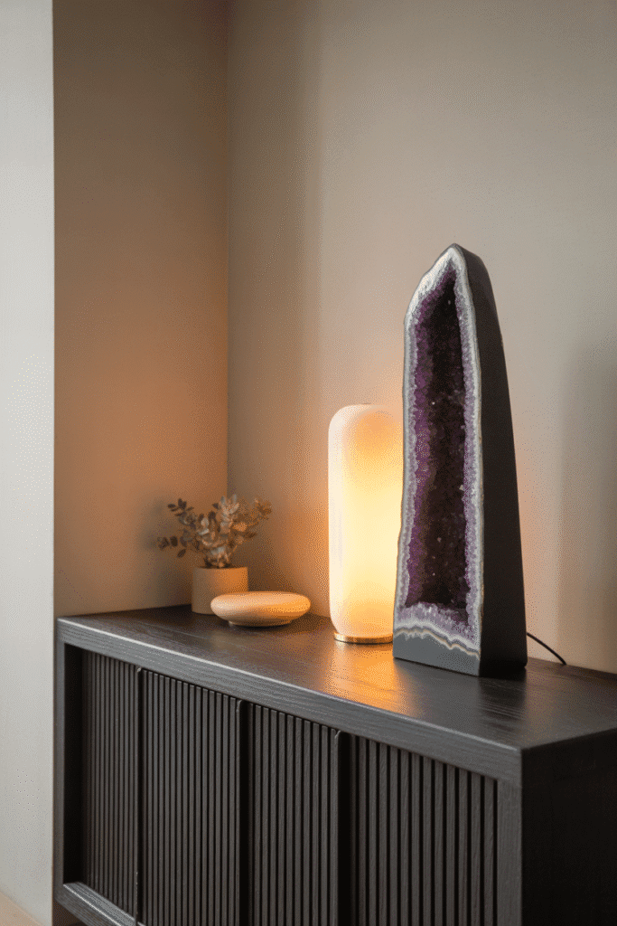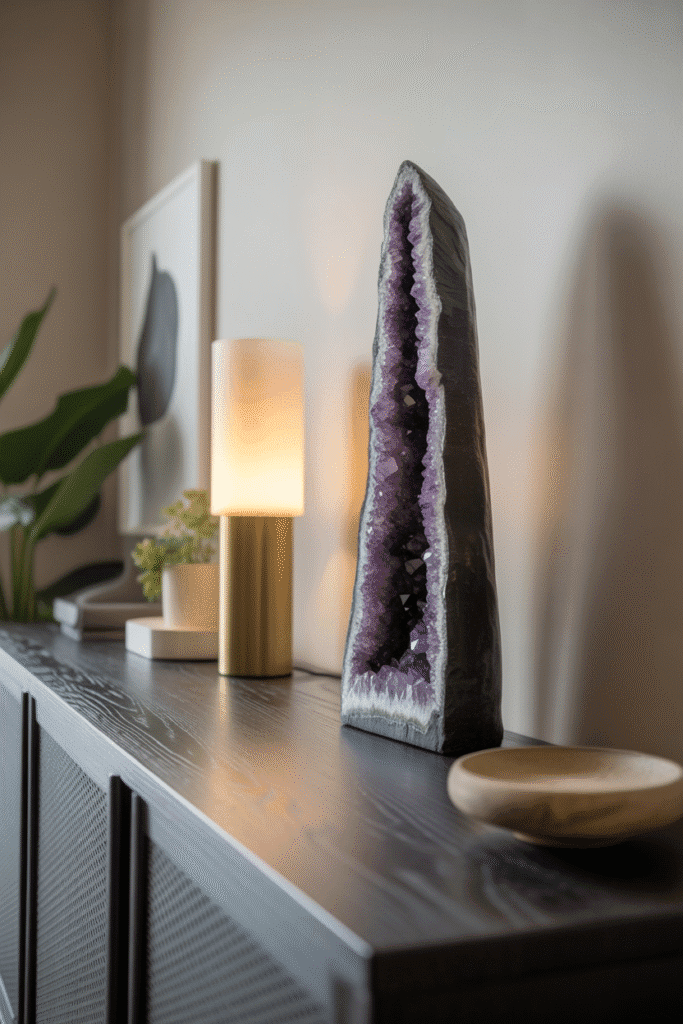 An upright amethyst geode makes a dramatic statement without needing anything flashy. Place it on a sideboard, entry table, or floating shelf where it can stand tall. Use soft lighting nearby to highlight its texture and color. Let it stand alone or surround it with low decorative objects to enhance its height. It works well as a natural sculpture in both eclectic and refined spaces.