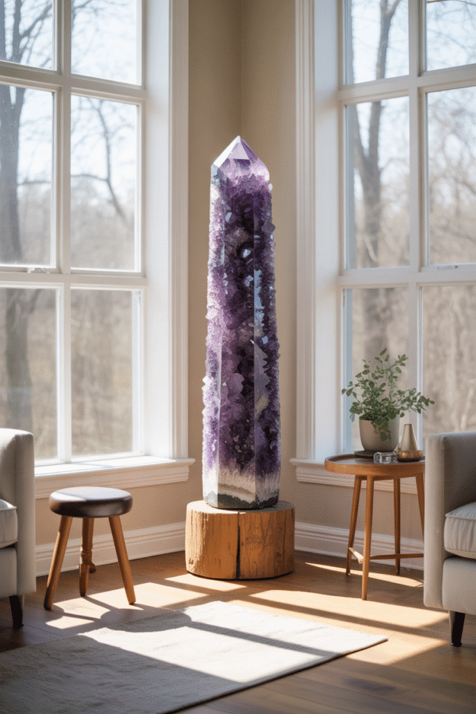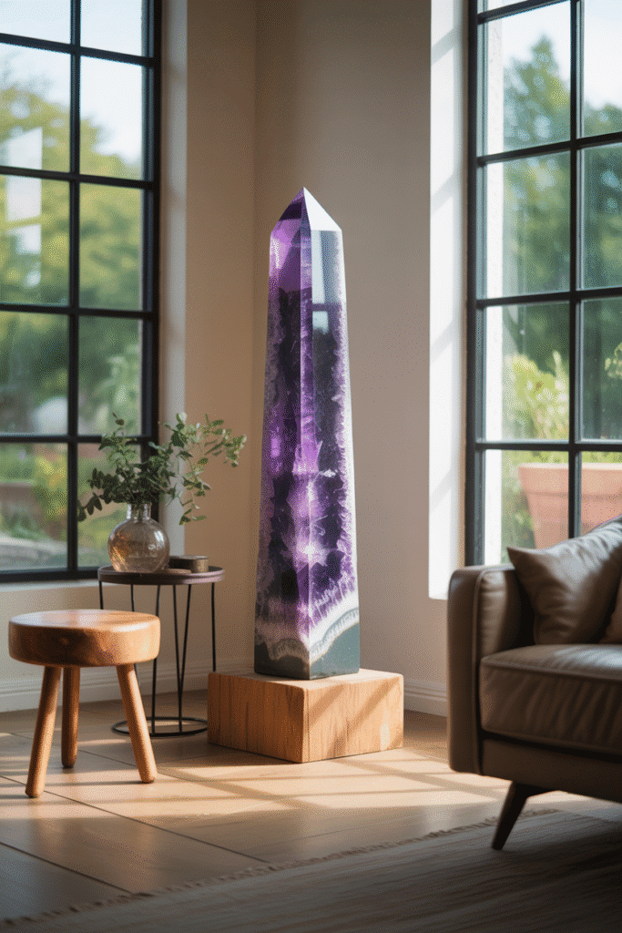 If you have space, choose a single large crystal, like a tall smoky quartz or amethyst point, to place on the floor in an empty corner. Use a stone base or wood slab beneath it for stability. This brings height and elegance to forgotten parts of the room. Add a small stool or side table nearby to turn it into a styled zone.