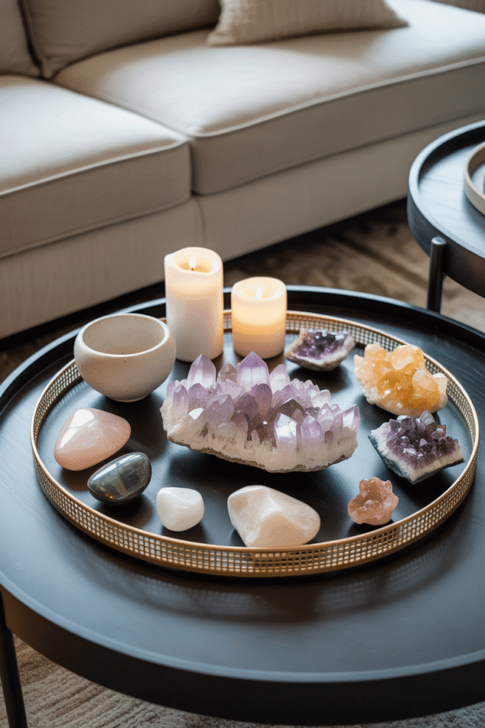 Use a large tray to layer crystals of different types and sizes. Mix polished and raw pieces for texture contrast. Anchor the display with one dominant crystal and surround it with smaller accents. This creates an intentional and ever-evolving centerpiece. Keep the color scheme cohesive to avoid visual clutter.
