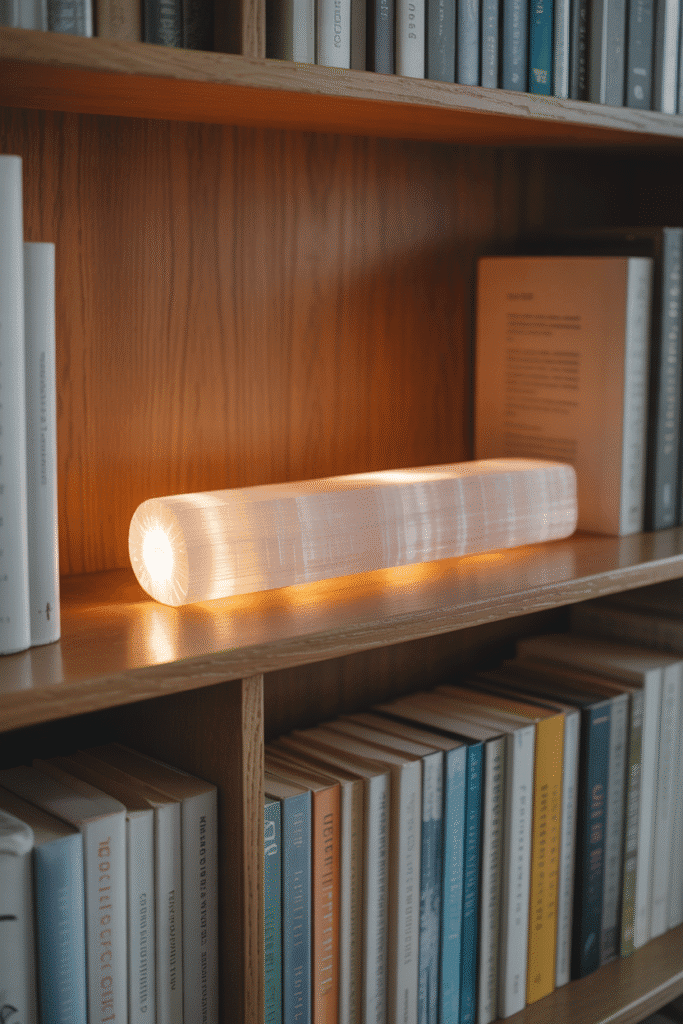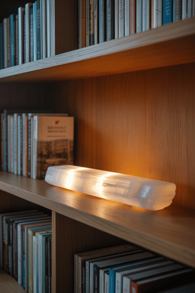 Long, smooth selenite pieces reflect light in a soft, ethereal way. Lay one horizontally across a bookshelf to add contrast and flow. Use it to break up stacks of books or separate decor items. The sheen of selenite adds brightness to darker woods or bold-colored books. Keep the surrounding decor minimal to allow its clarity to stand out.