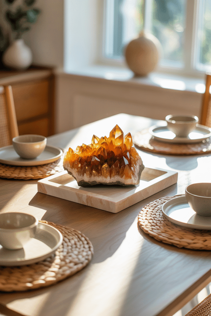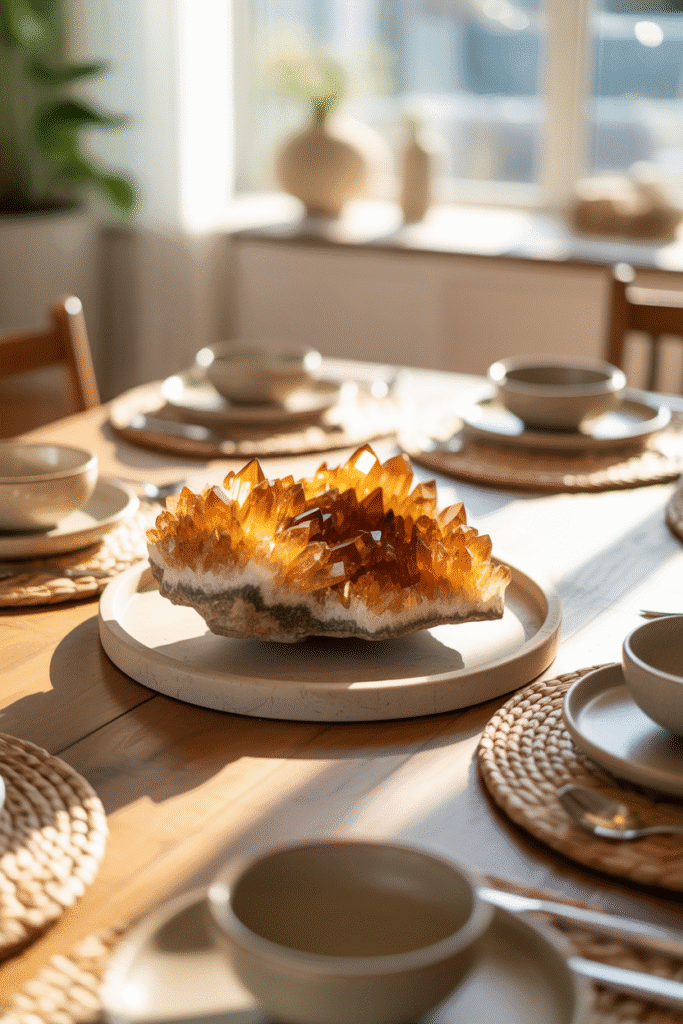 Choose a large citrine cluster to sit in the center of your dining or kitchen table. Its golden tones bring warmth and visual energy to the room. Place it on a wood or stone tray with neutral accents. This setup works well in rooms with lots of natural light. It also functions as a conversation piece during gatherings.