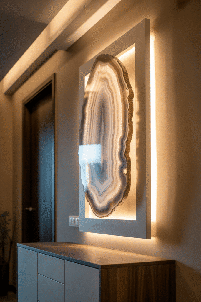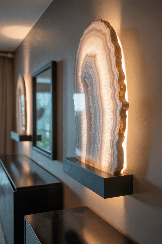 Agate slabs with exposed edges and banded patterns make stunning wall art. Mount a single large piece in a hallway or office for a sculptural look. Use a floating frame or custom bracket to secure it. The natural lines of agate add movement and serenity to your walls. Choose tones that complement your existing decor for easy integration.