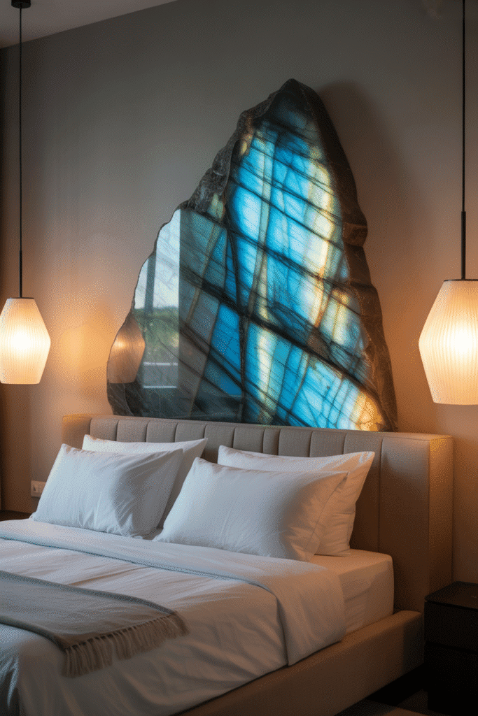 Mount or lean a large labradorite slab behind the headboard or at the base of the wall. The shifting colors of labradorite bring mystery and softness to your bedroom. Keep your bedding and surrounding decor simple so the crystal becomes the feature. Use wall sconces or pendant lights to enhance its shimmer at night.