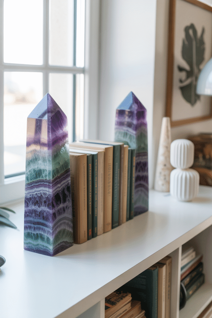 Two tall fluorite points work beautifully as bookends on an open shelf or console. The color variations add interest without taking over the space. Choose fluorite pieces with a polished base for extra stability. This combination of function and beauty is ideal for reading nooks or home offices.