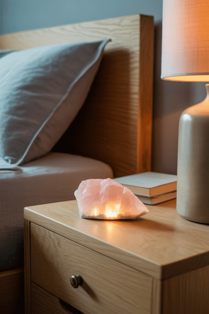 Rose quartz brings both color and softness to your bedside. Choose a raw, unpolished slab and place it next to a lamp or small stack of books. Let it anchor the area without clutter. The gentle pink tone works well with muted neutrals or cool gray bedding. It adds a subtle, calming energy to your evening routine.