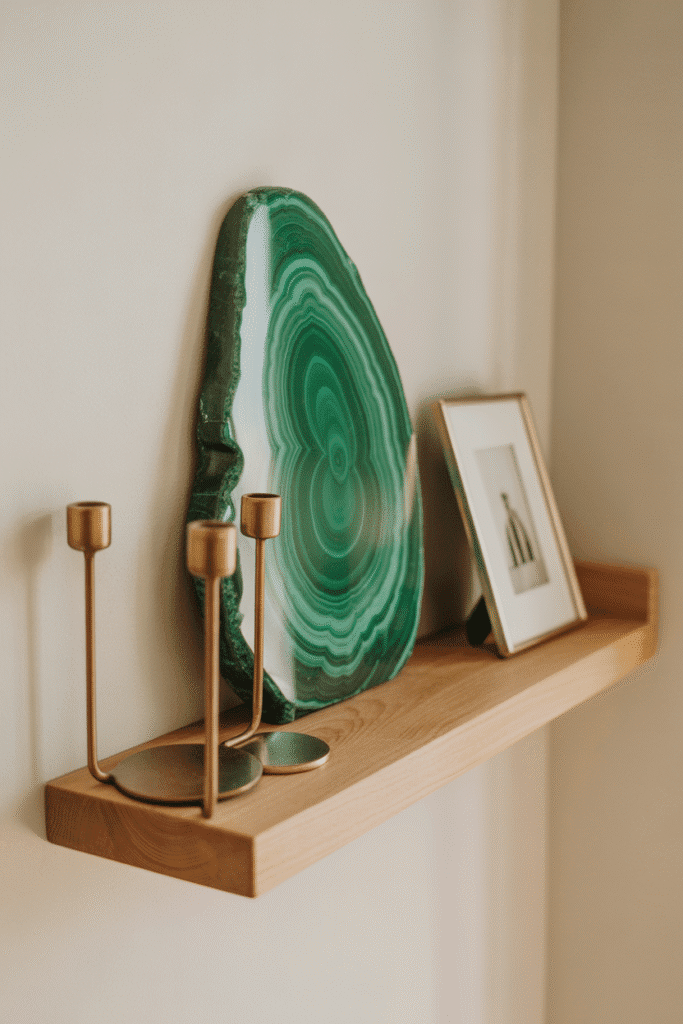 Malachite’s deep green tones and swirling patterns add a luxurious feel. Lean a large slice against the wall on a floating shelf or mantel. Frame it with smaller objects like candles or a photo frame. This method keeps the decor asymmetrical and visually dynamic. Malachite also pairs beautifully with gold or brass accents.