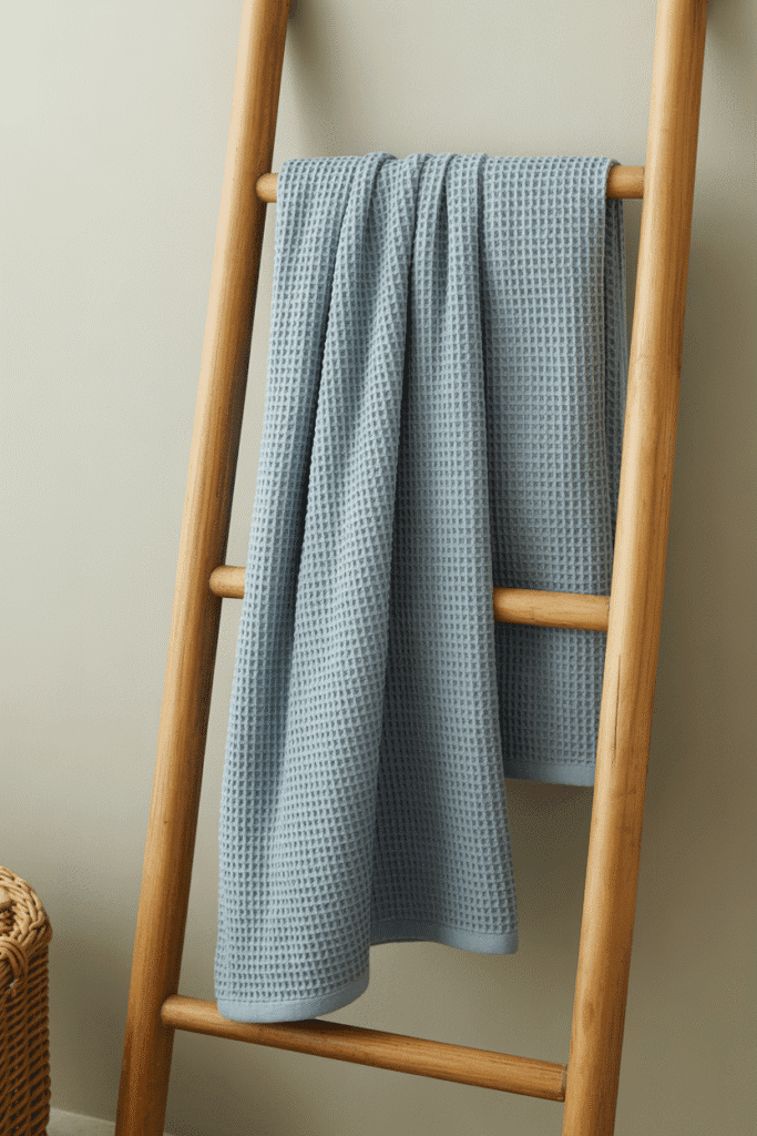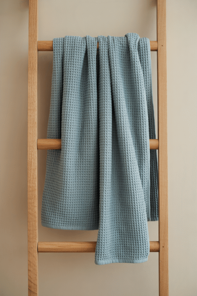 7. Soft blue waffle weave towels displayed on open wooden ladder