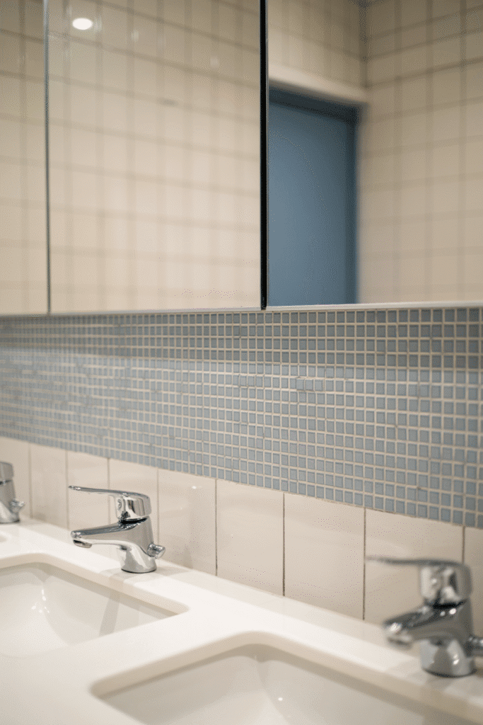 Behind your bathroom mirrors, install a strip of mosaic tiles in a cornflower tone. The tiles should be small, irregular and placed in a narrow band. They will reflect both your image and the light, adding depth to what is usually a blank wall. This can be done in a rental using peel and stick versions. It is a detail that brings personality without overwhelming the space. You see it every day, so let it speak softly but clearly.