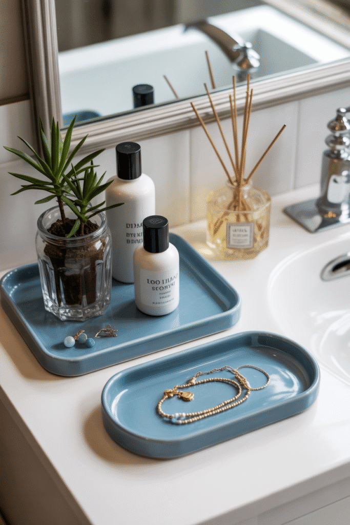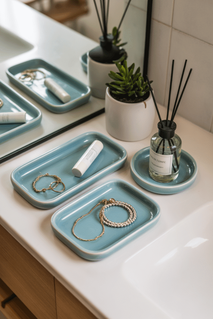 Use one or two shallow trays in pale blue ceramic to corral jewelry, lip balm, or fragrance bottles. They prevent clutter from spreading across the sink. The color keeps it light and calming while the ceramic adds heft and permanence. You can layer in a small plant or incense to create a tiny still life. It is practical but also thoughtful. Every surface feels more grounded when it has edges.