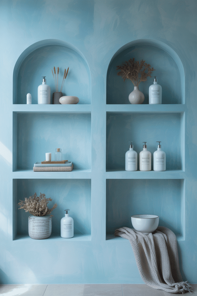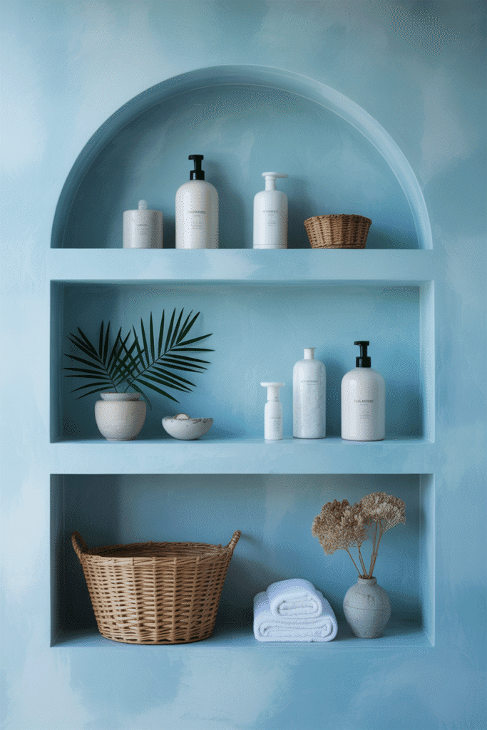 If your bathroom has built in shelves, paint the back wall inside them in a soft ocean tone. The color makes everything stored there look more intentional. White bottles or neutral items pop against it without clashing. This trick creates visual depth even in shallow spaces. It is easy to change later, but for now it gives every item its own stage. Sometimes paint is the only styling you need.