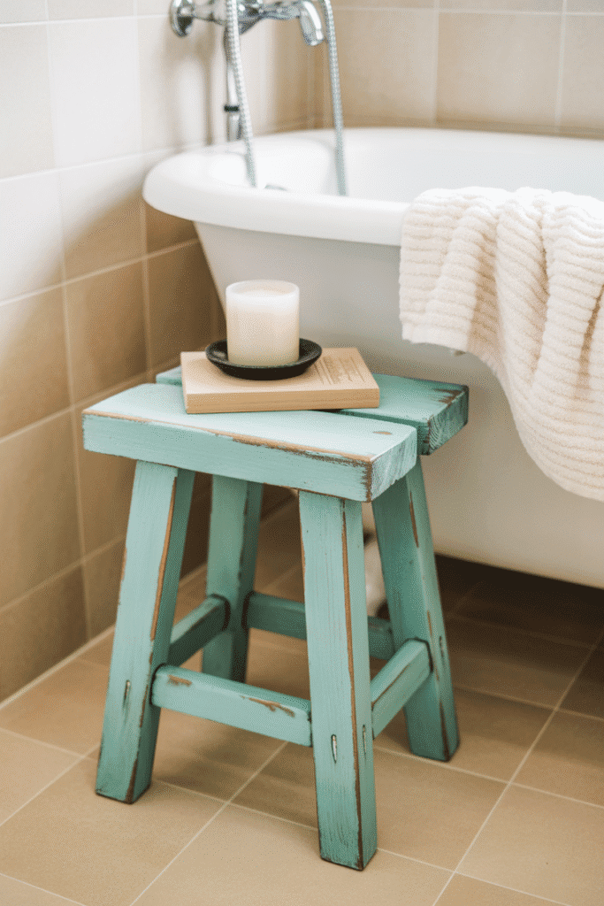 Choose a small wooden stool and give it a light turquoise wash, letting some of the grain show through. Set it beside the bath to hold a towel, candle or book. It feels coastal without leaning too themed. The color fades slightly with use, which only adds to its charm. This is furniture that supports without dominating. You will use it daily without thinking and miss it when it is not there.