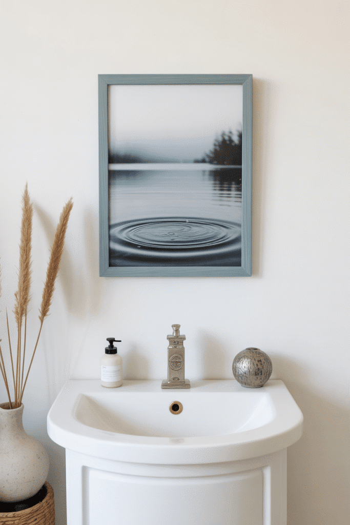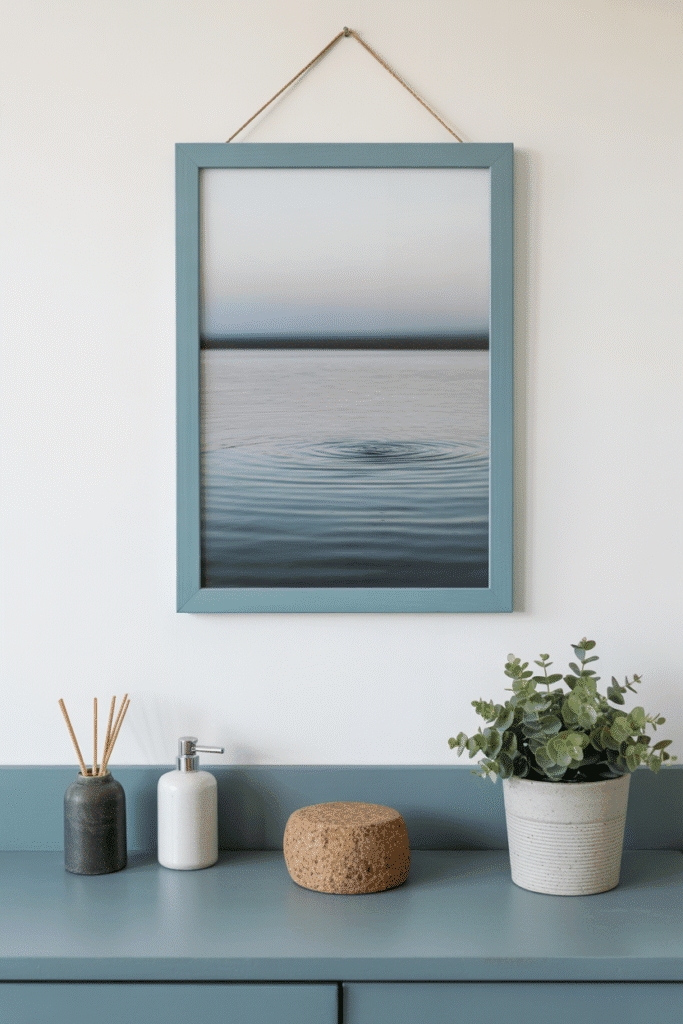 Pick one art print of a calm lake, foggy coastline or abstract ripple. Frame it in a baby blue frame with a slight matte texture. Hang it where you see it as you leave the room. It acts as a visual pause that resets your mood. The colors should feel quiet and peaceful, not busy or loud. Art in the bathroom can be subtle and still have impact.