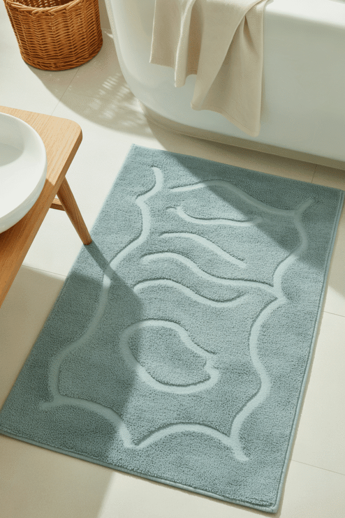 A good bath rug should feel like something you want to stand on. Choose one in a soft blue with an irregular pattern like broken waves or foam trails. It adds comfort underfoot and draws your eye downward without being flashy. Machine washable but visually elevated, this kind of rug bridges comfort and style. Your toes will thank you every morning.