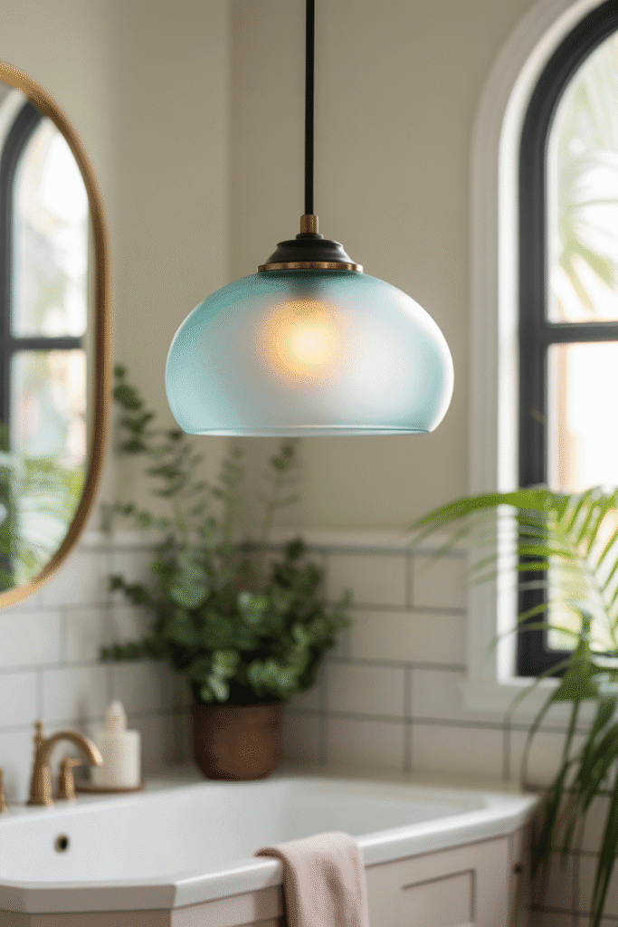 Over the vanity or near the tub, swap in a pendant light with a pale cerulean shade. The frosted glass softens glare and casts a glow that feels more like candlelight than electricity. It adds color even when switched off. A small shift in lighting changes how every surface reads. This one detail makes your whole bathroom feel more considered.
