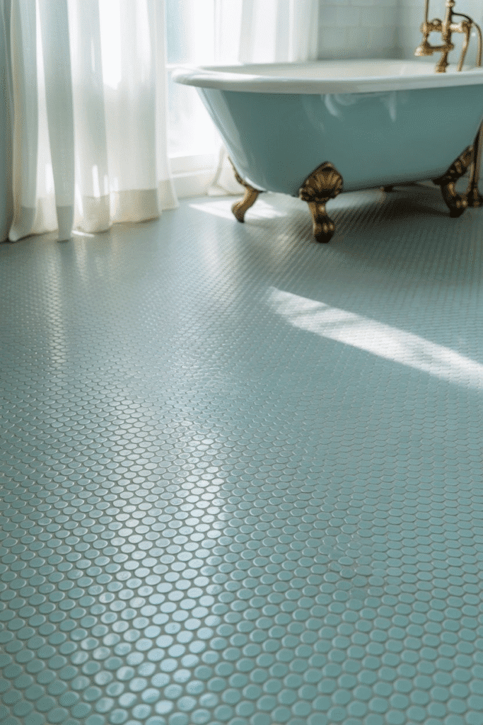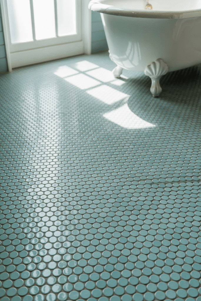 These small circular tiles reflect light like water droplets frozen in place. When laid across the bathroom floor, they give the space a rhythmic texture that feels both calm and alive. The soft gray grout keeps the look clean without introducing any sharp contrast. You can walk barefoot and feel like you are stepping into something soothing. It grounds the room without weighing it down. This is one detail that quietly elevates everything else around it.