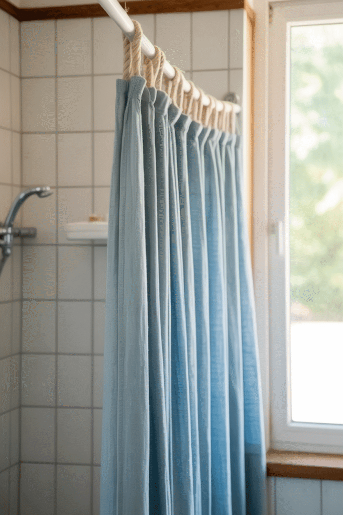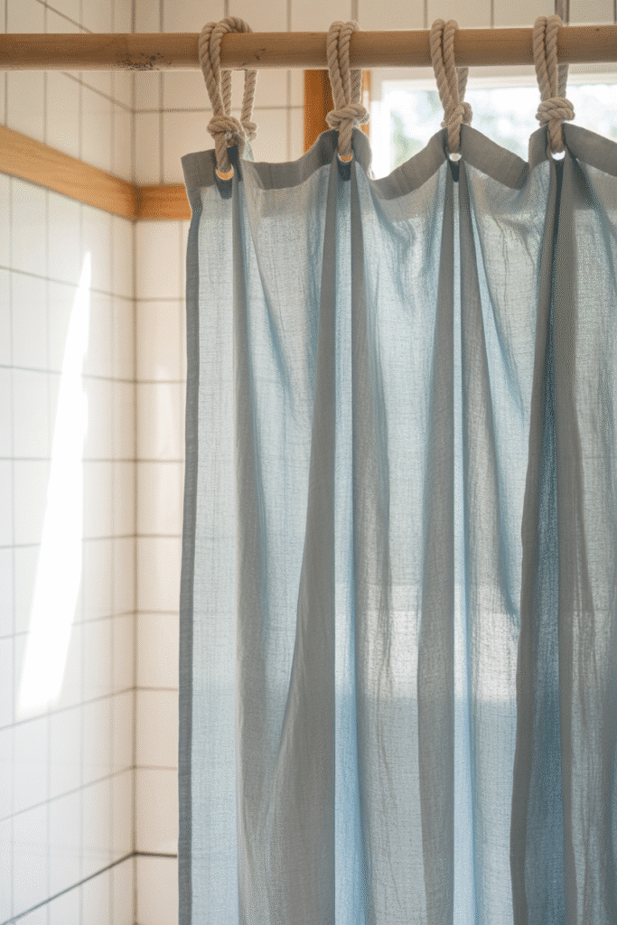 Linen has a texture that never feels overdesigned. In a soft blue tone, it carries the airiness of early morning fog. Hang it using thick cotton rope instead of standard rings to add a gentle, handcrafted feel. The folds move like cloth waves as you pull it closed. It instantly softens hard tile lines in the room. This small change makes the entire shower area feel warmer and more welcoming.