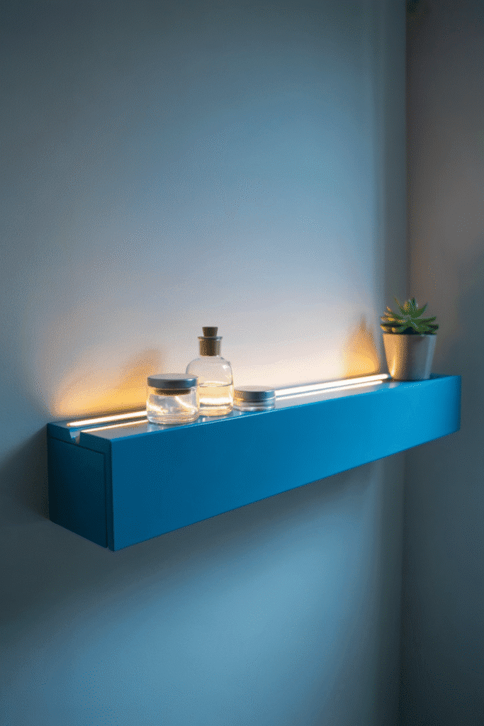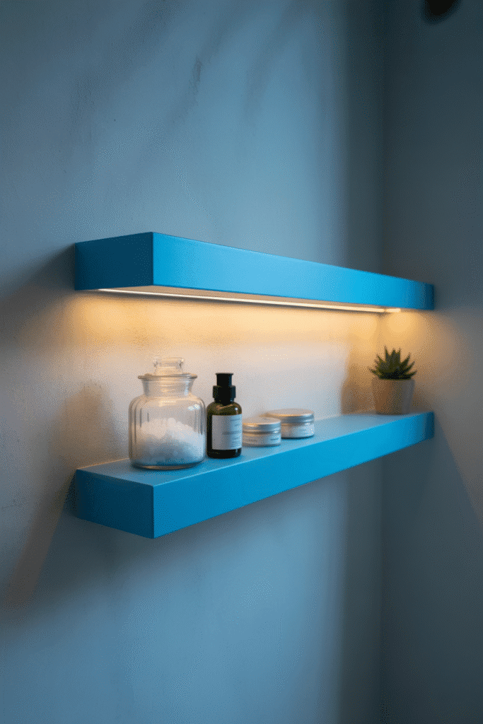 A pale blue shelf gives you space to store essentials while adding a flash of color to a white or gray wall. Tuck LED lighting underneath to create a soft glow that lights up glass jars and bottles from below. It turns a storage spot into something almost theatrical. You can keep it minimal or dress it up with textures like wood or ceramic. The light draws your eye but never shouts. It makes the wall come alive after dark.