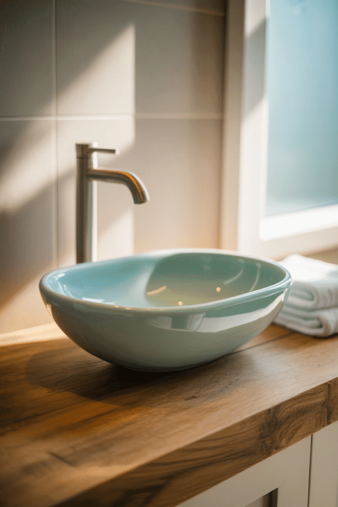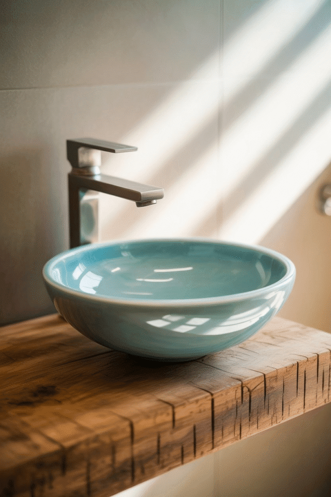 The cool smoothness of an aqua sink contrasts beautifully with the earthy texture of old wood. A vessel sink has presence without needing to be massive. When placed on a slab of reclaimed teak or oak, it feels both refined and organic. The blue tone gives the illusion of still water held inside the bowl. It turns hand washing into a sensory moment. This is function wrapped in simple beauty.