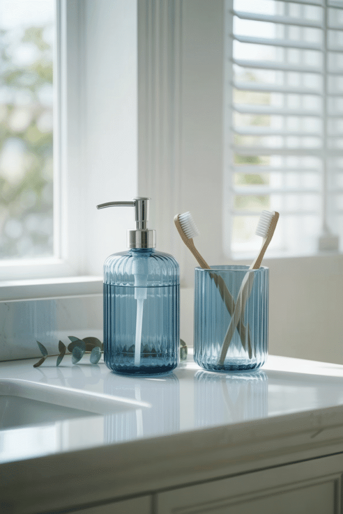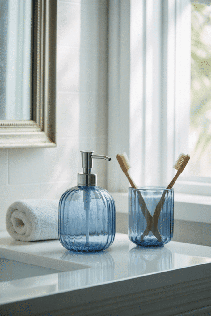 Glass in a soft powder blue shade catches light in a gentle, elegant way. When grouped together on your vanity, these pieces instantly organize the chaos of everyday items. The finish stays clean and resists stains from toothpaste or soap. It is a detail you touch every day, so it deserves more thought. Together, these items feel like a matched set of tiny sculptures. They bring intention to a space that is often overlooked.