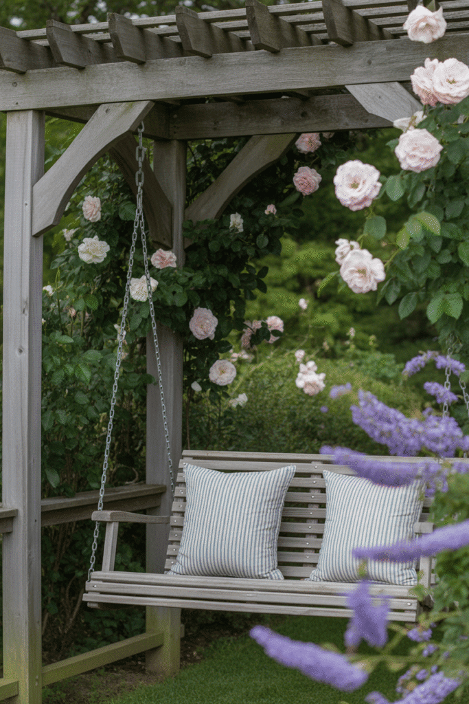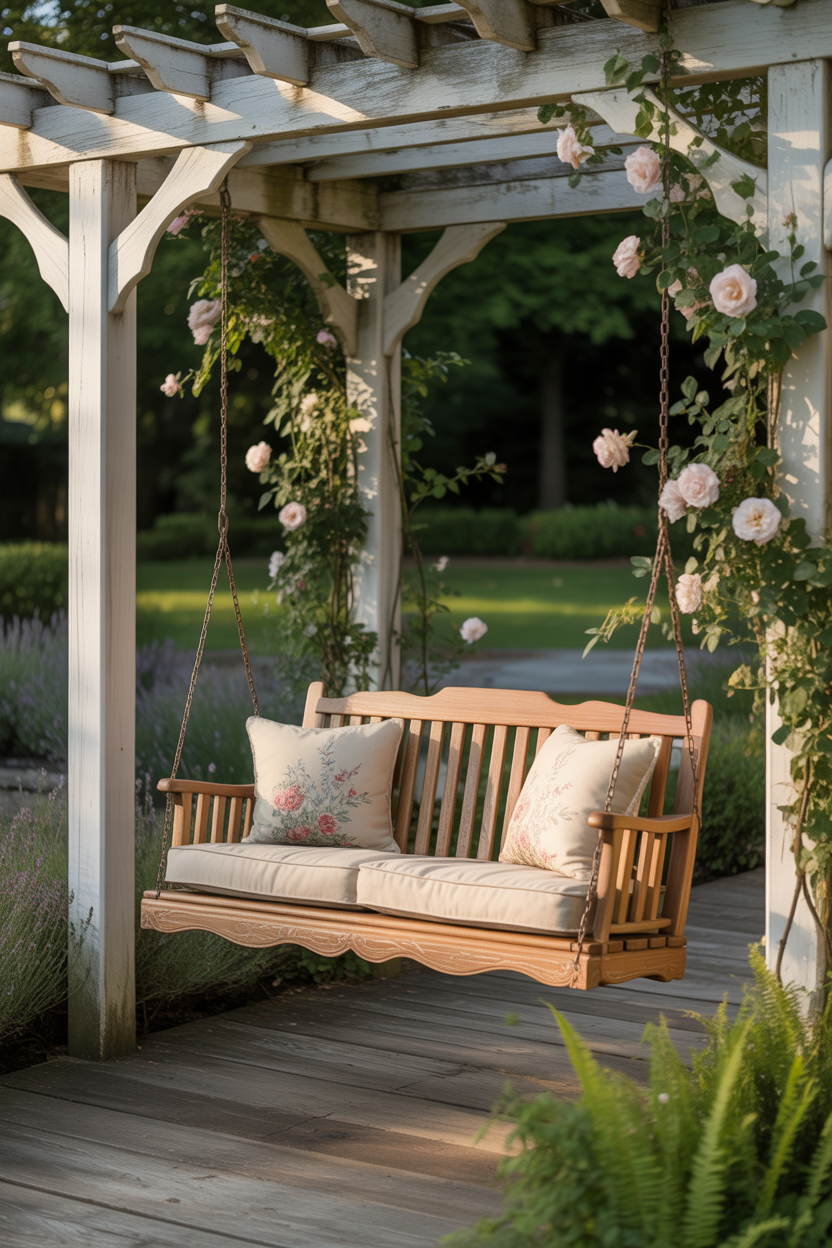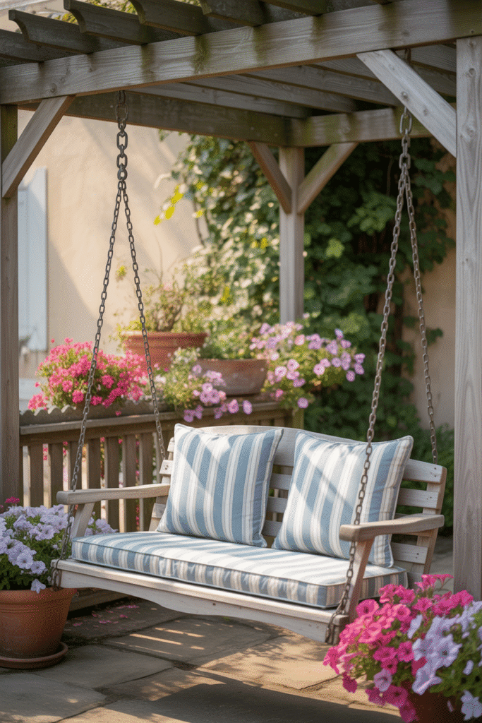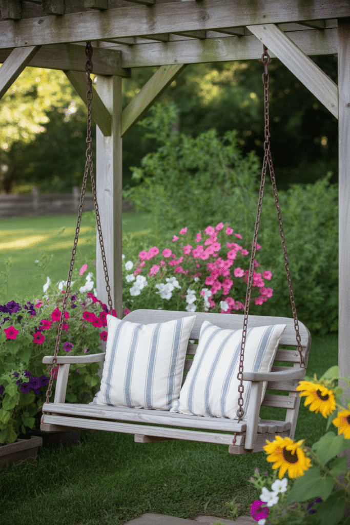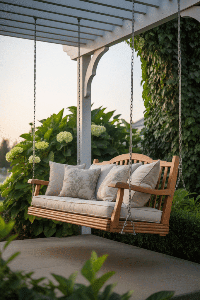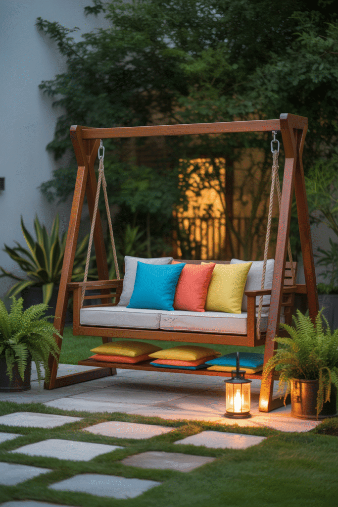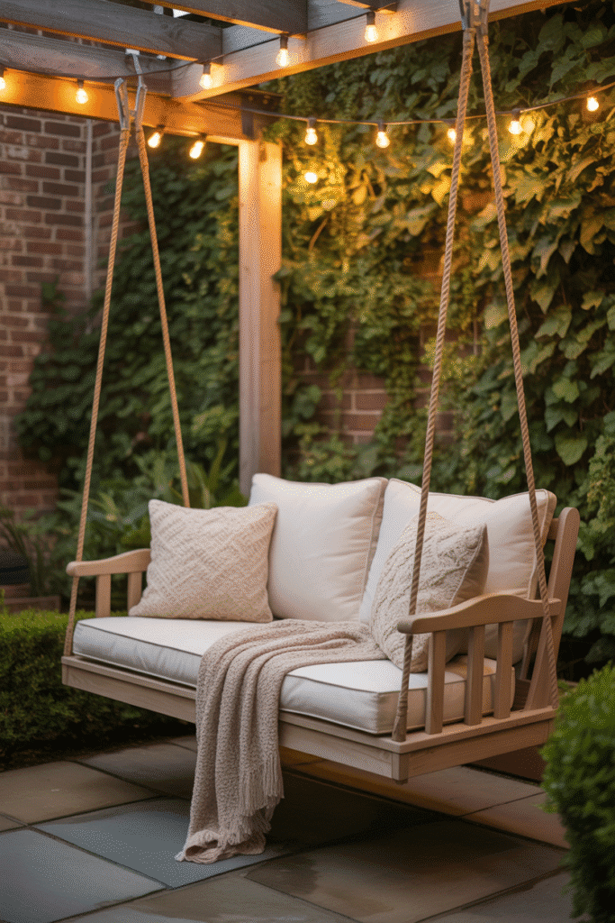 A wooden porch swing never goes out of style and brings a timeless, inviting charm to any backyard. It works beautifully on a traditional porch, under a pergola, or even suspended from a sturdy tree. Add plush cushions and throw pillows for extra comfort, and consider using weather-resistant fabrics to keep it looking fresh. Wooden swings can be stained for a natural look or painted in cheerful colors to brighten your outdoor space.