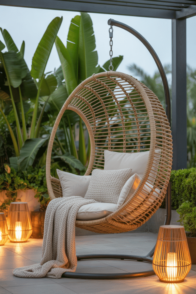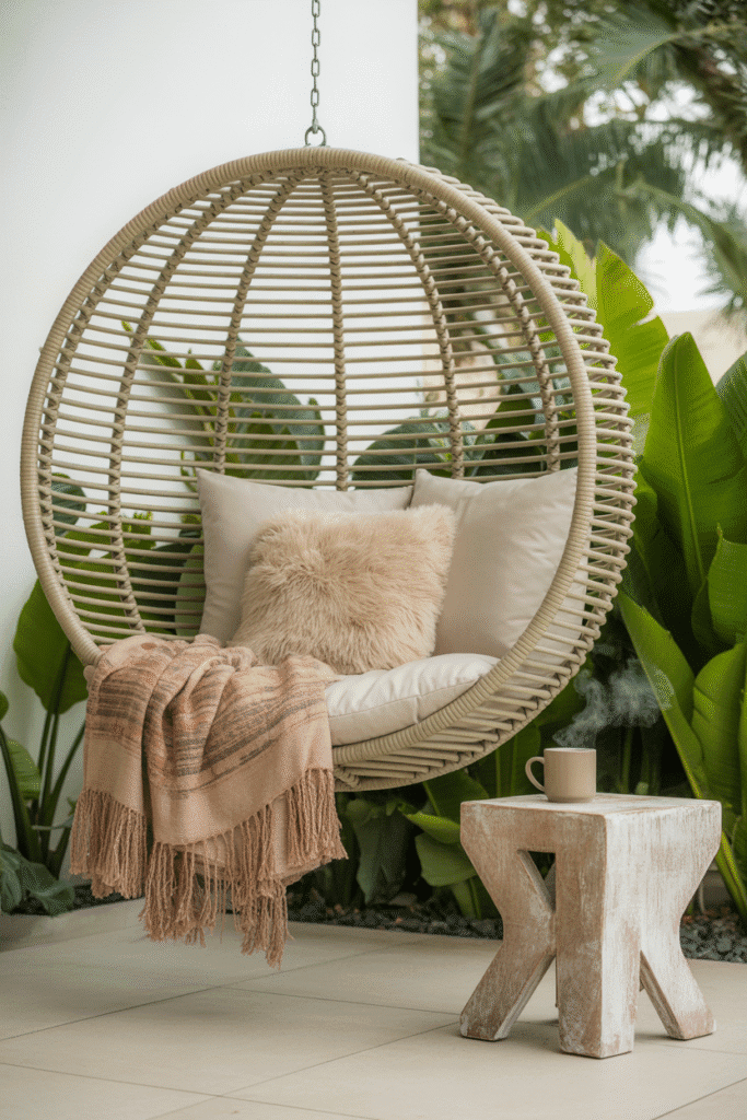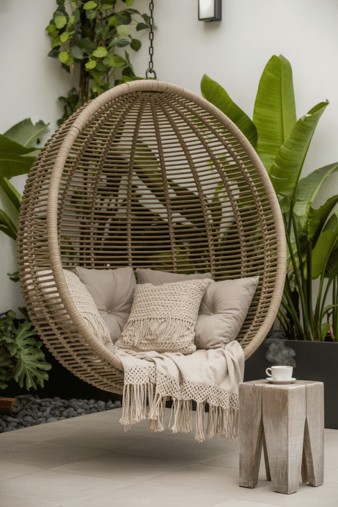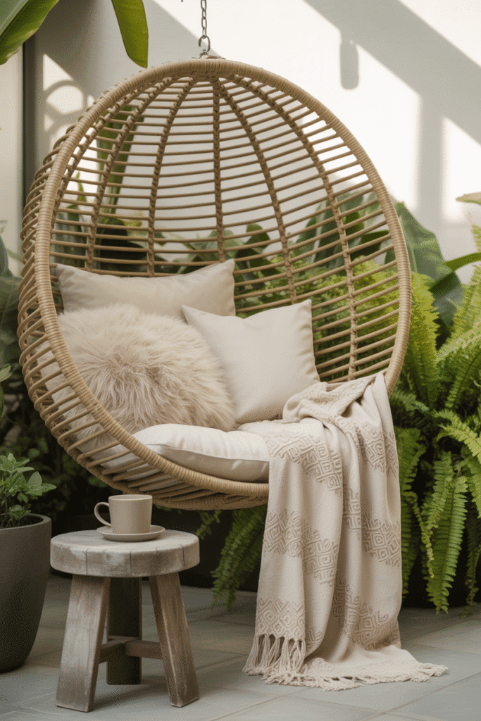 Rattan egg chairs create a cocoon-like effect, making them both stylish and cozy. Their rounded shape offers a sense of privacy while still being airy and open. They pair beautifully with bohemian or modern spaces and look especially striking with layered throws. Hanging one in a corner with a small side table creates the perfect nook for unwinding.