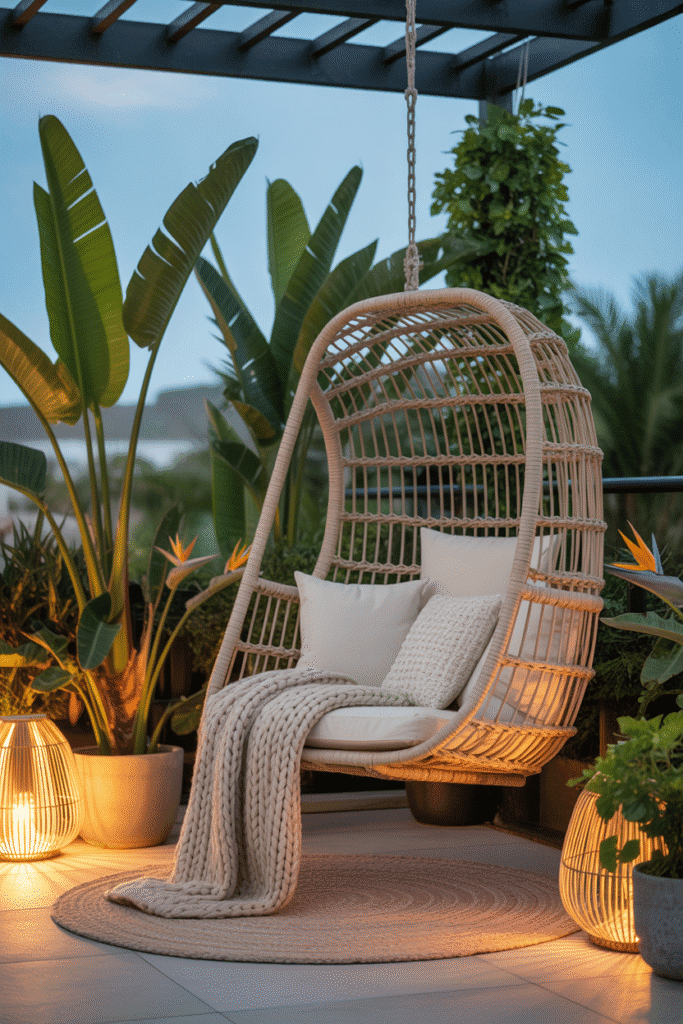Wicker swings add texture and a natural feel to patios, blending well with coastal, bohemian, or farmhouse decor. They are lightweight yet durable, making them easy to style with cushions or blankets. For a modern twist, try a painted wicker finish in black or white for a sleek, updated look. Pair the swing with potted greenery or lantern lighting to create a cozy corner for morning coffee or evening relaxation.