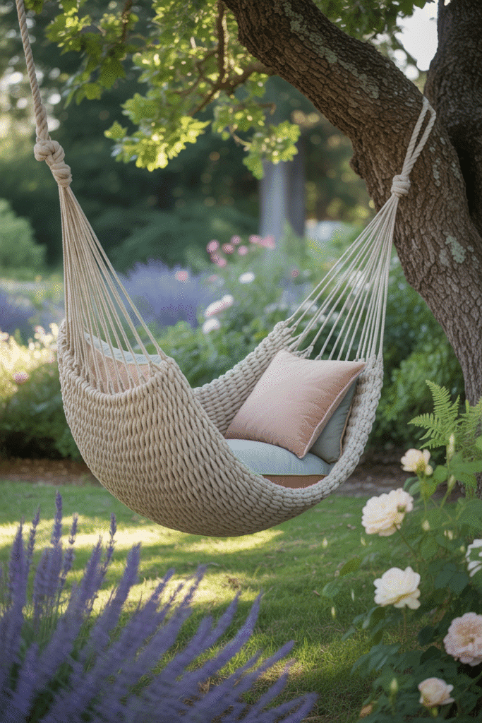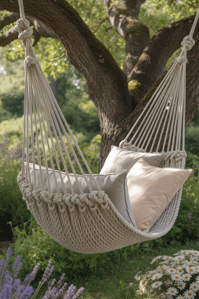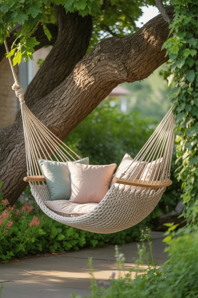 A rope hammock swing brings a breezy, carefree vibe to your backyard. Lightweight and versatile, it can be hung from a pergola, gazebo, or even a sturdy branch. It is perfect for curling up with a good book, listening to music, or simply swaying gently in the breeze. Add layered cushions or a soft blanket to make it more inviting and comfortable.