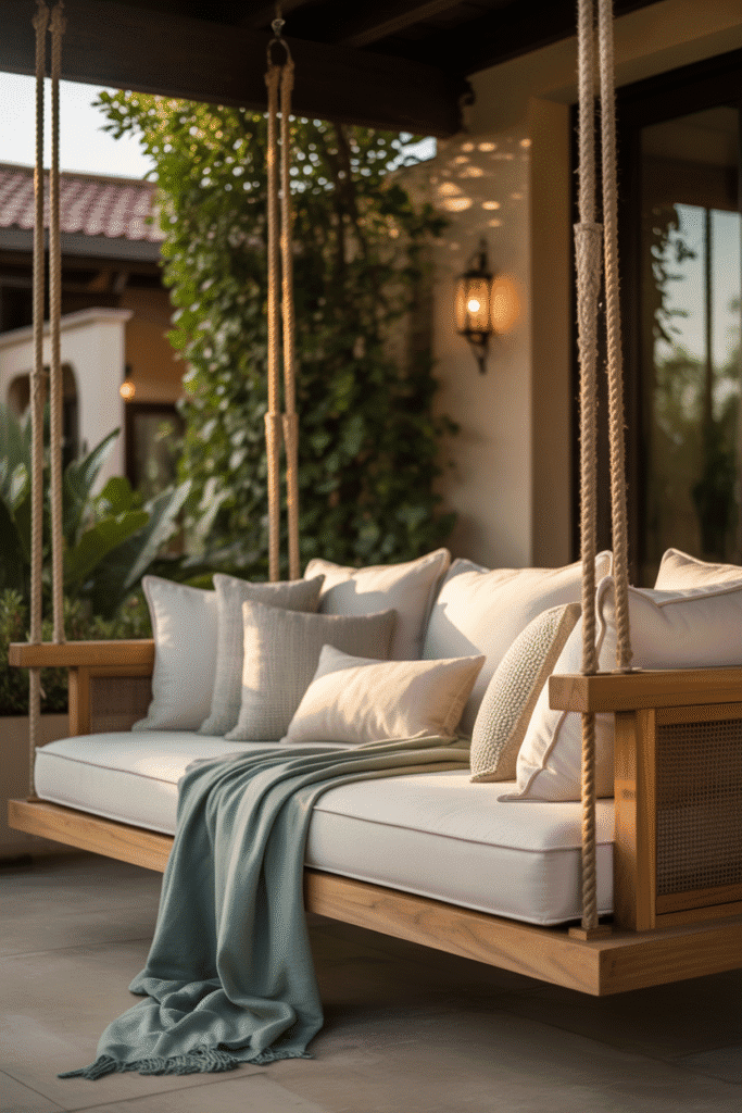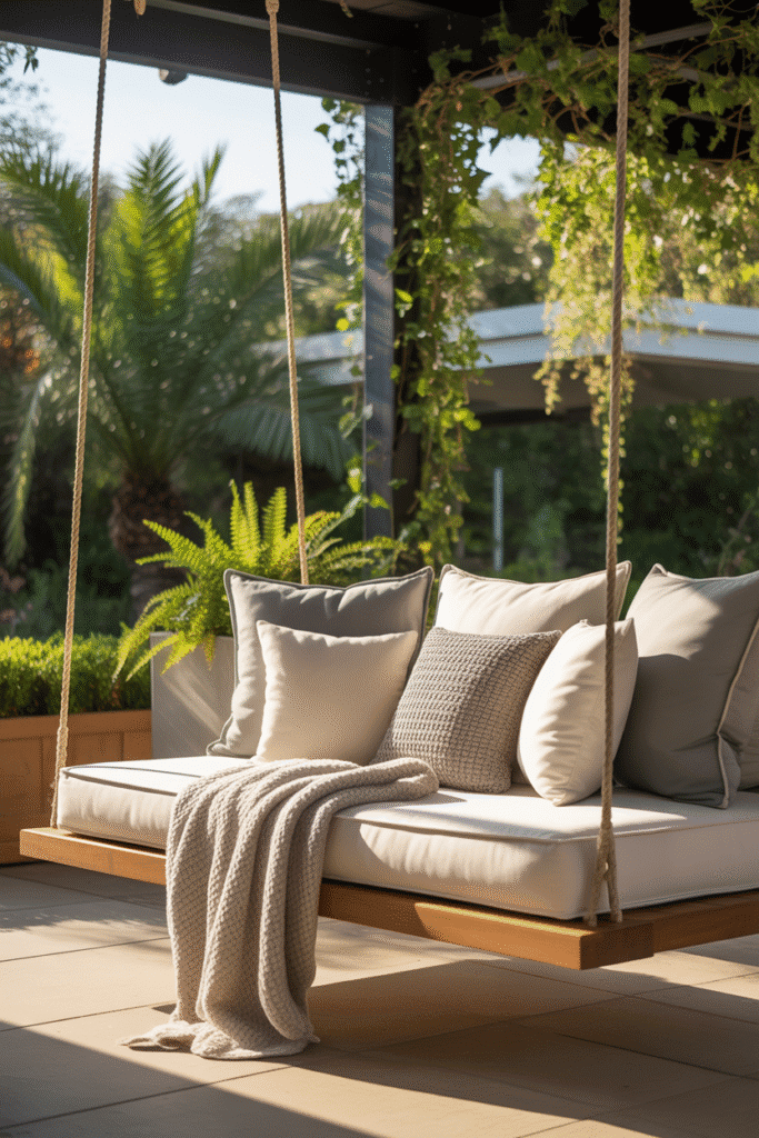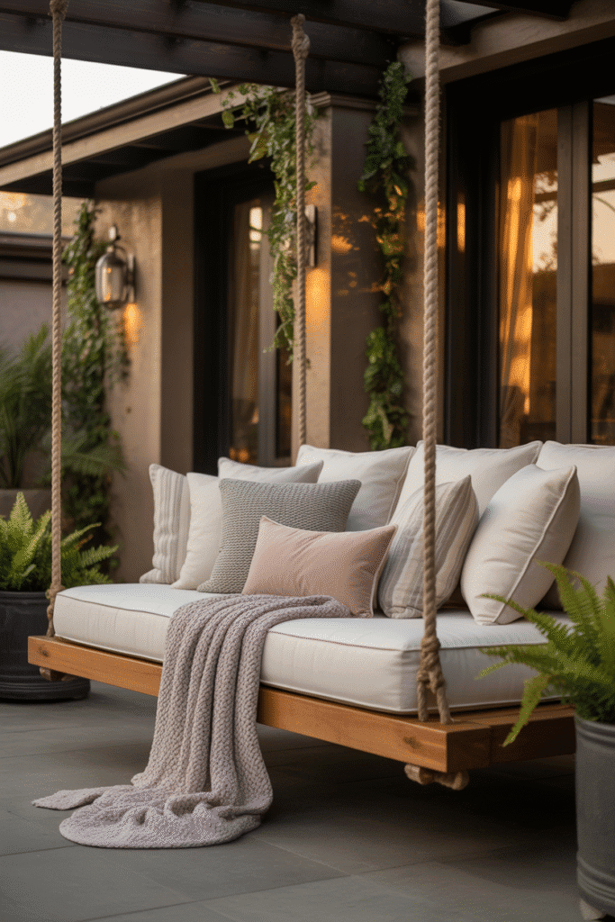 A daybed swing offers the ultimate in comfort, giving you enough space to stretch out fully. It is ideal for lazy summer afternoons, naps, or even as an outdoor guest lounge. Style it with an assortment of pillows and a throw to make it feel like an extension of your indoor living room. Placed under a covered patio, it creates a luxurious spot for both relaxation and entertaining.