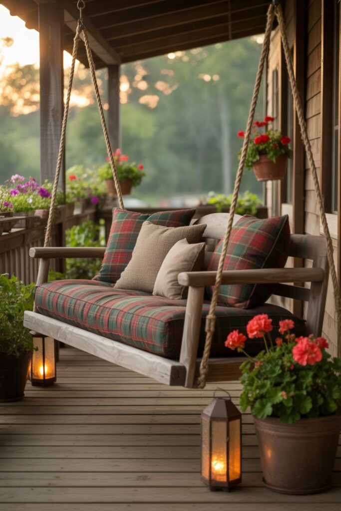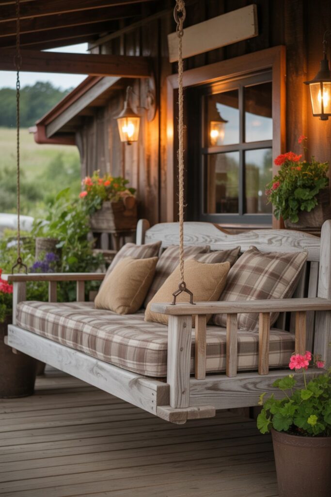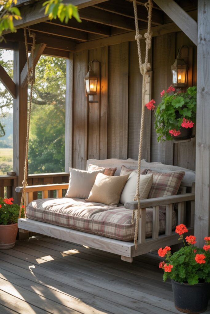 Farmhouse style swing beds are rustic and oversized, making them perfect for families or large patios. Their chunky wood frames bring warmth and coziness to outdoor spaces. Style them with plaid cushions, burlap details, or soft throws to emphasize the rustic charm. They work well under covered porches and can easily become the centerpiece of your backyard.