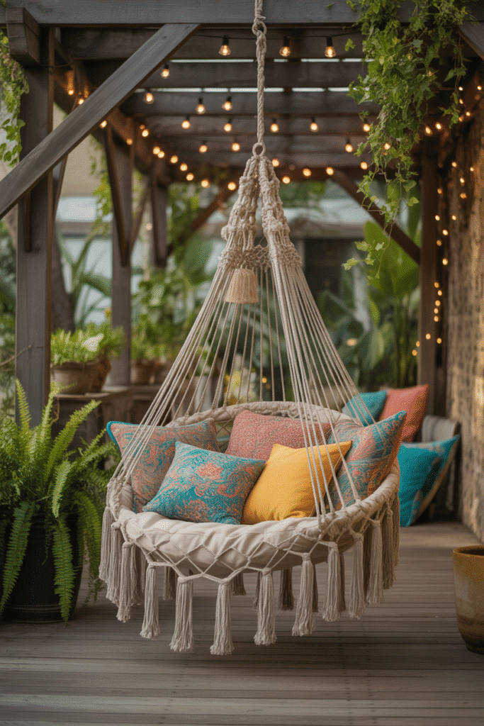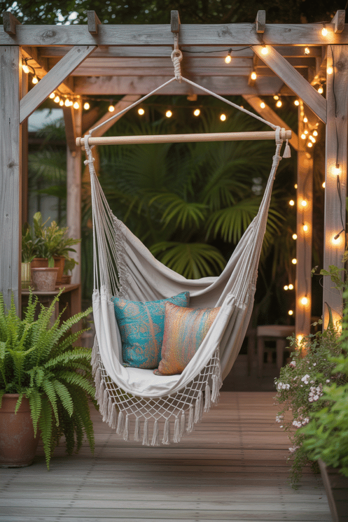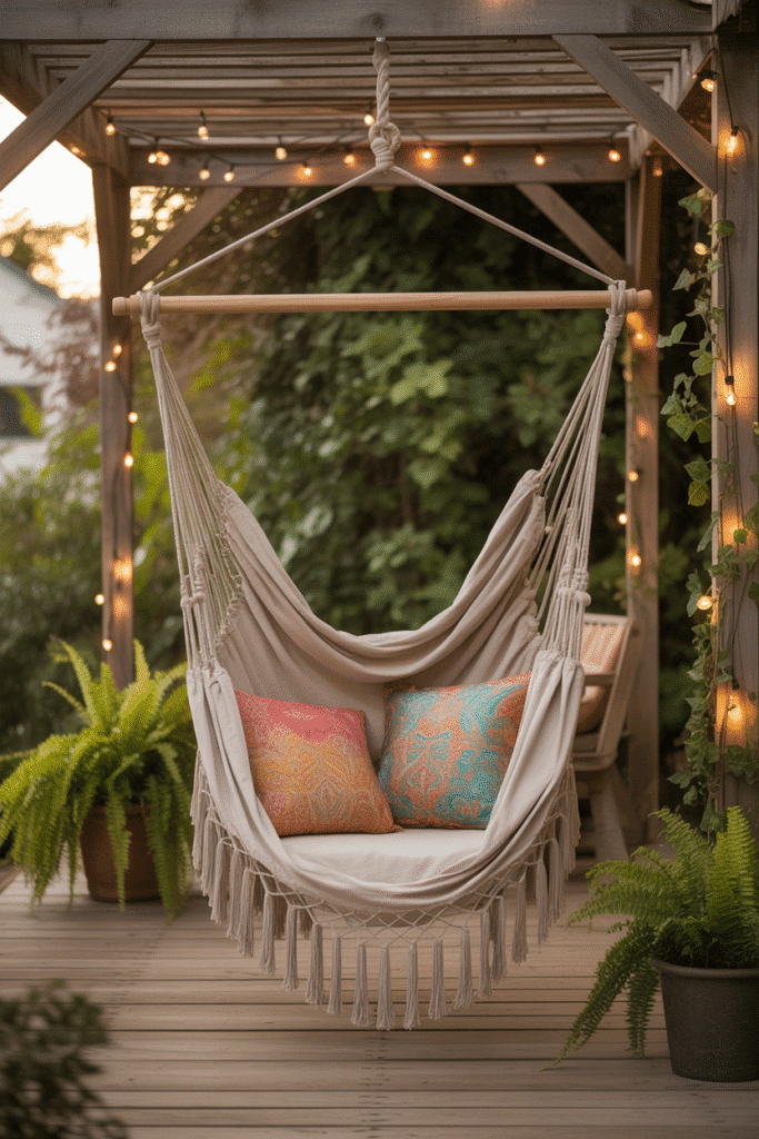 For a touch of bohemian flair, a fabric hammock swing with fringe or tassels is an excellent choice. It adds a decorative element while still being incredibly comfortable. Choose one in neutral cotton for a soft look or opt for bold, colorful fabric to make a statement. This type of swing pairs well with string lights or lanterns for a relaxed, festival-inspired vibe.