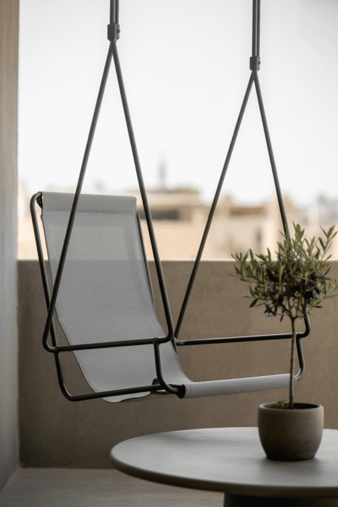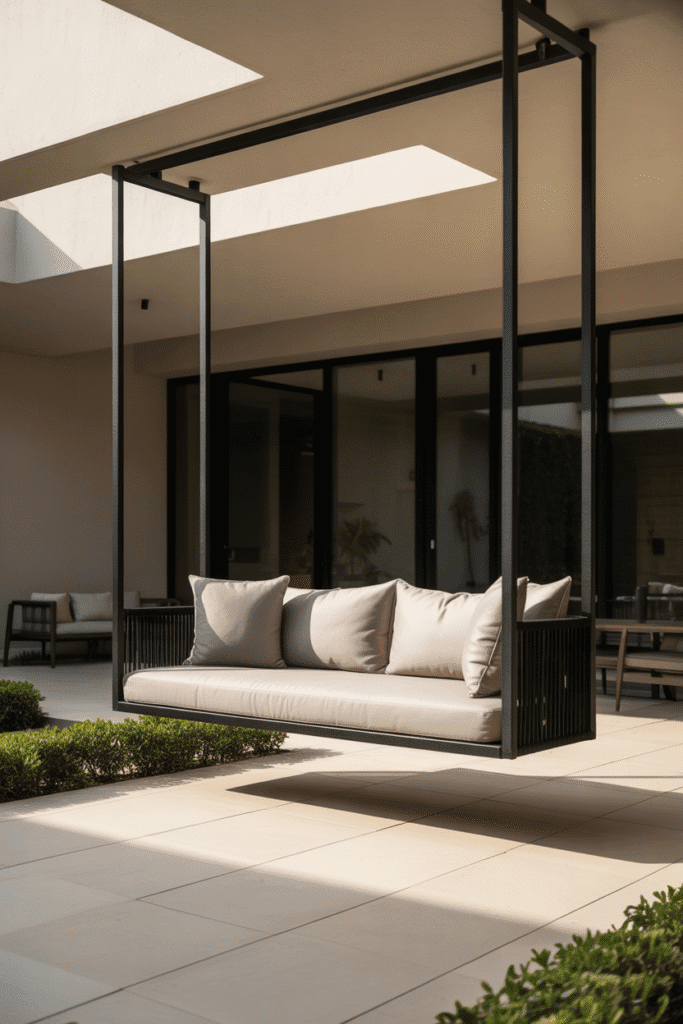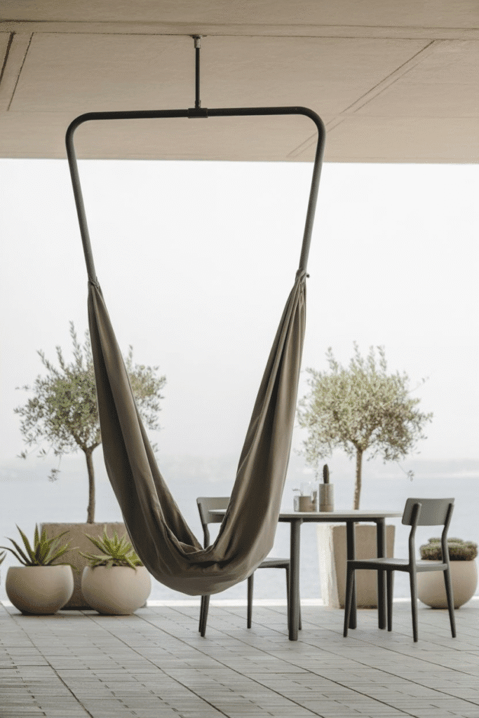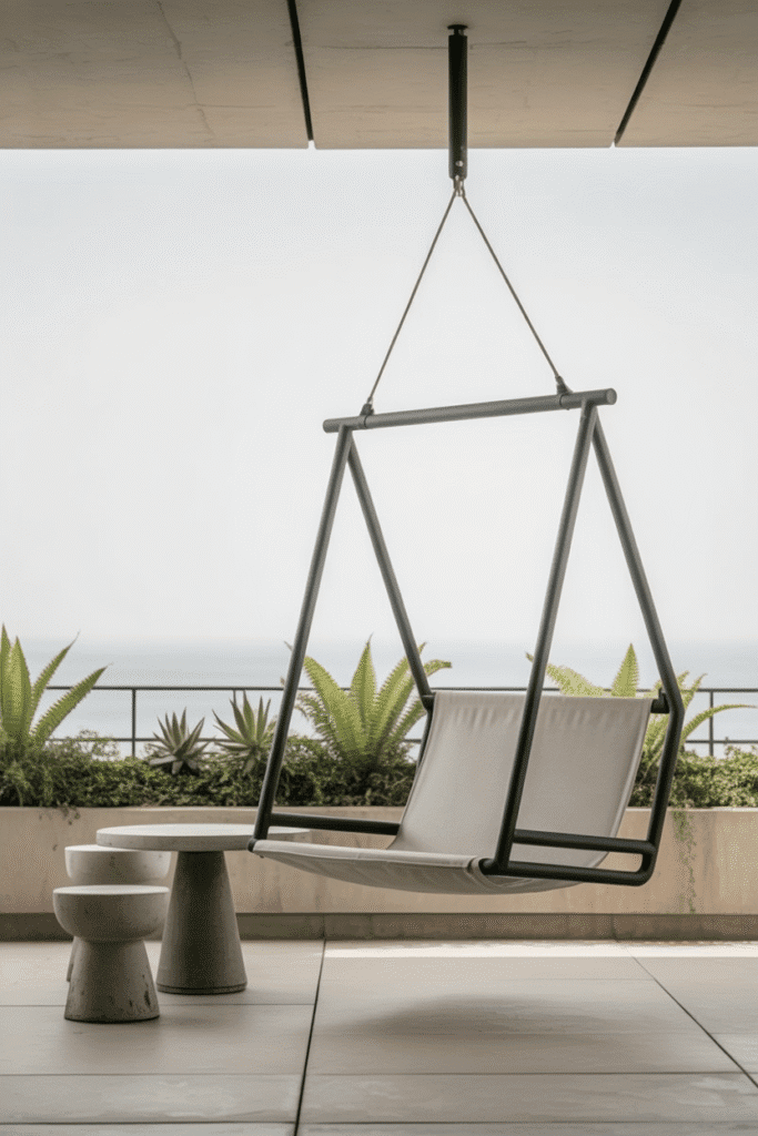 Minimalist sling swings are all about simplicity and comfort. They often feature a single fabric sling stretched over a sleek frame, creating a modern and uncluttered look. These swings are perfect for contemporary patios or small urban balconies. With their clean lines, they can be styled up with a single cushion or left bare for a striking effect.