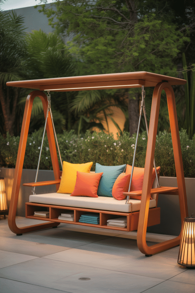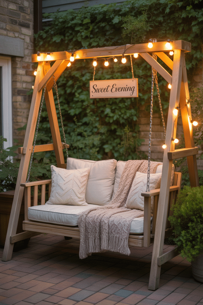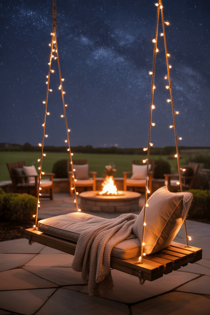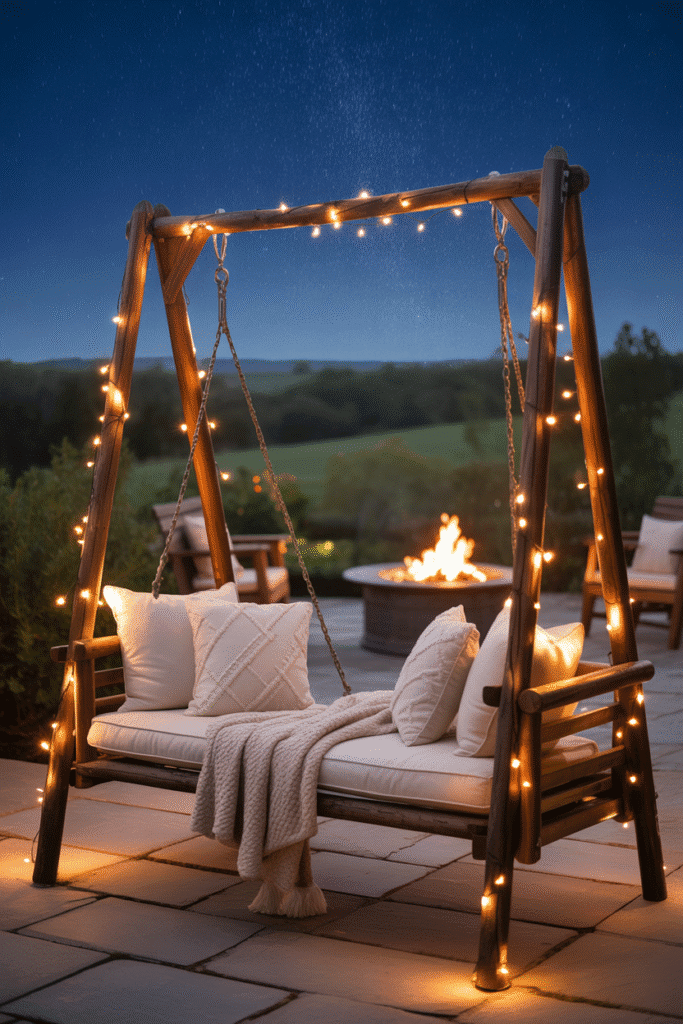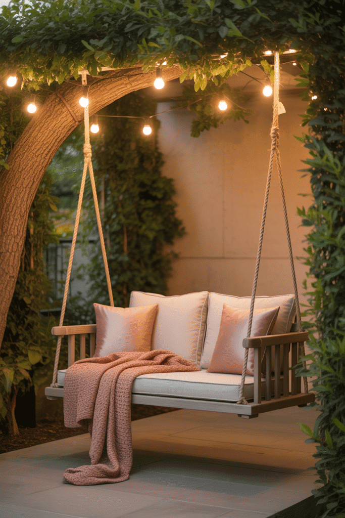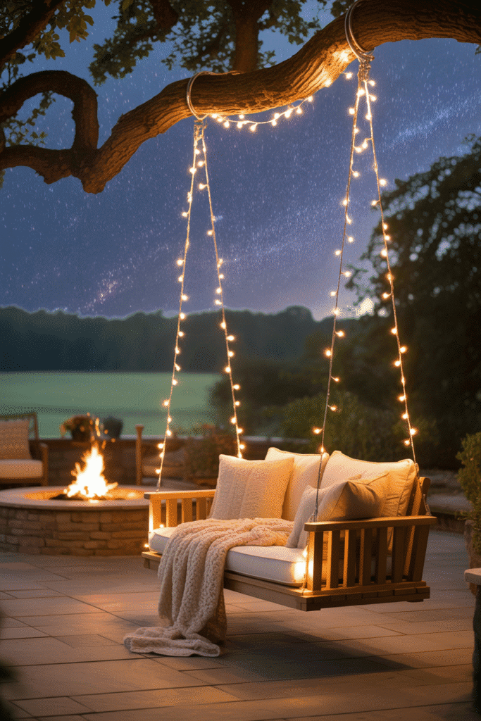 Adding a swing with built in lighting or surrounding it with fairy lights creates a magical nighttime atmosphere. LED lights make the swing functional after dark while also adding a warm, inviting glow. This is especially appealing for evening gatherings or romantic moments under the stars. Pair it with a fire pit or outdoor lanterns to complete the ambiance.