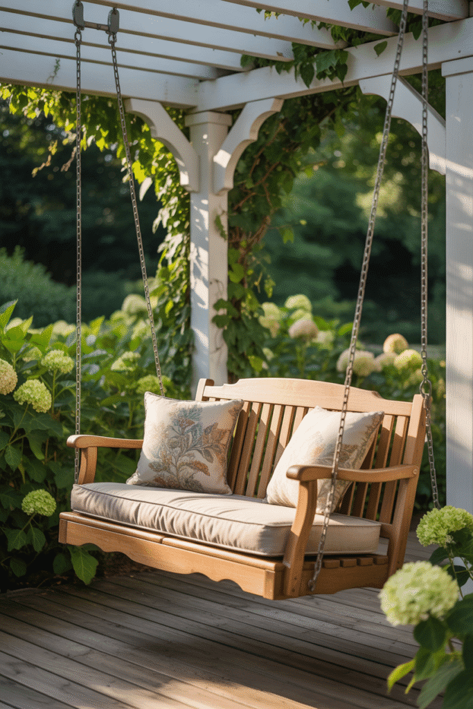 A wooden porch swing never goes out of style and brings a timeless, inviting charm to any backyard. It works beautifully on a traditional porch, under a pergola, or even suspended from a sturdy tree. Add plush cushions and throw pillows for extra comfort, and consider using weather-resistant fabrics to keep it looking fresh. Wooden swings can be stained for a natural look or painted in cheerful colors to brighten your outdoor space.