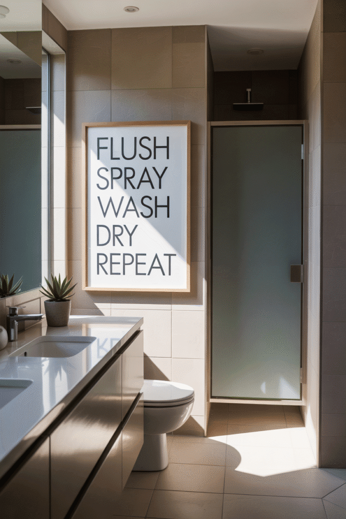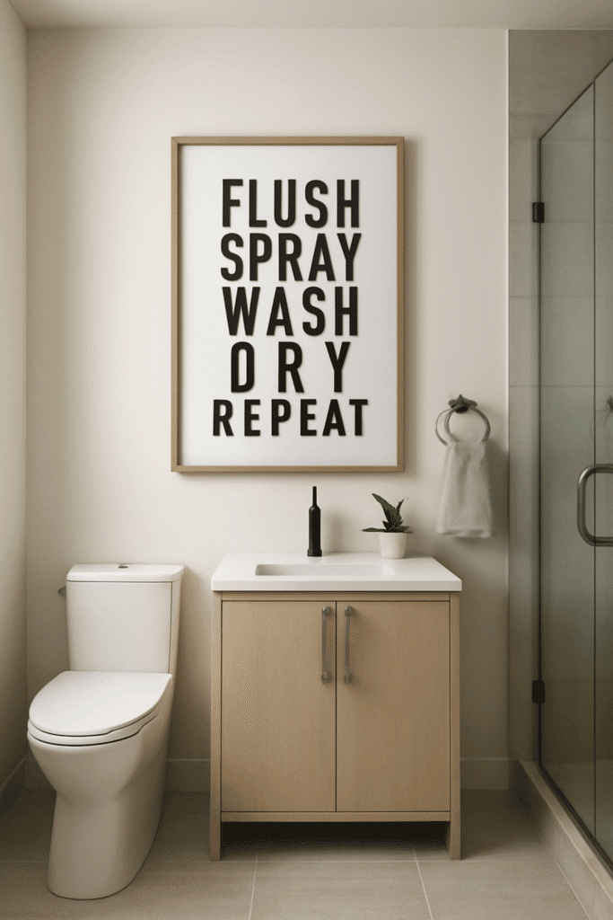 Forget the polite reminders. Create a framed sign with bold text listing clear and cheeky rules like Flush Spray Wash Dry Repeat. Use a modern font and neutral tones to keep it stylish. It sets expectations while adding a dose of realism and wit. Guests will chuckle, and the household will have no excuses.